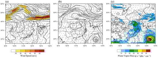 ERA5 circulation situation at 0000 UTC on 30 July 2023: (a) 200 hPa geopotential height (contours, unit: gpm), and wind field (vectors, unit: m/s, shading represents the upper-level jet); (b) 500 hPa geopotential height (contours, unit: gpm), and wind field (vectors, unit: m/s); (c) 850 hPa geopotential height (contours, unit: gpm), wind field (vectors, unit: m/s), and water vapor flux (shaded, unit: g·s−1·hPa−1·cm−1).