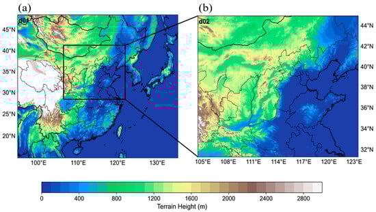The simulated area in the WRF model: (a) two nested domains (d01: 9 km, d02: 3 km), d02 is outlined by the black box; (b) d02 configuration. The color shading represents terrain height (unit: m).