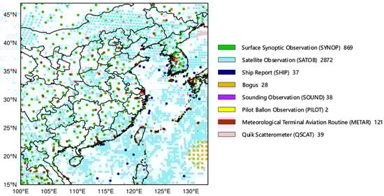 For assimilation experiments, conventional observations and AGRI clear-sky radiance data from water vapor channels are utilized. Since heavy rainfall over land exhibits stronger local characteristics and more rapid evolution, 1 h assimilation interval is selected for the assimilation scheme. To explore the impact of FY-4B AGRI clear-sky assimilation, a set of comparative experiments is designed (Table 2). The first experiment (after as CTRL) assimilates only conventional observations in d01 and d02. Figure 5 shows the distribution of assimilated conventional observations in d01 at 1200 UTC on 30 July, which can be seen to cover the simulation area. The second experiment (DA_wv123) builds upon CTRL by additionally assimilating AGRI clear-sky radiance from water vapor channels 9, 10, and 11 in d02. With the clear-sky assimilation scheme, observations affected by clouds are rejected (Figure 6). Furthermore, in order to achieve better satellite assimilation effects, a two-step assimilation approach is adopted in this study. In d02, conventional observations are assimilated at first to preliminarily improve the initial conditions, thereby facilitating more effective assimilation of subsequent data in the second step. This approach has been further supported and validated by the study of Xu et al. [], which confirmed that convective-scale information is better captured when conventional and satellite observations are assimilated through this two-step process. Therefore, the third experiment (DA_2step_wv123) is based on DA_wv123 by first assimilating conventional observations in d02.