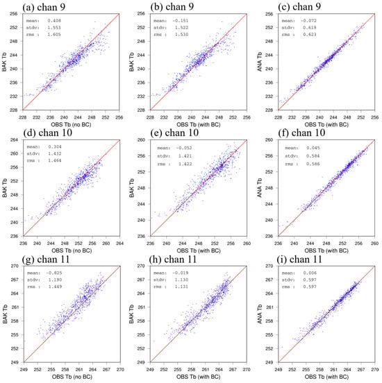 The scatterplots of (a–c) channel 9, (d–f) channel 10, and (g–i) channel 11 observation versus simulated TBs (unit: K) from background (a,d,g) before and (b,e,h) after bias correction, and (c,f,i) observation versus simulated TBs from the analysis of DA_wv123 valid at 1800 UTC on 30 July 2023.