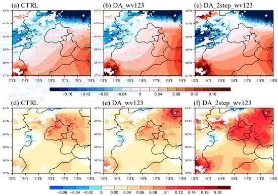 Figure 9d–f show that nearly the entire BTH region exhibits a positive QVAPOR increment, demonstrating that data assimilation effectively improves the moisture field, particularly with AGRI assimilation delivering the most marked benefit. Compared with CTRL and DA_wv123, DA_2step_wv123 generates a larger and stronger positive increment area over the BTH and southwest regions, thereby strengthening low-level water vapor and enhancing water vapor prediction.