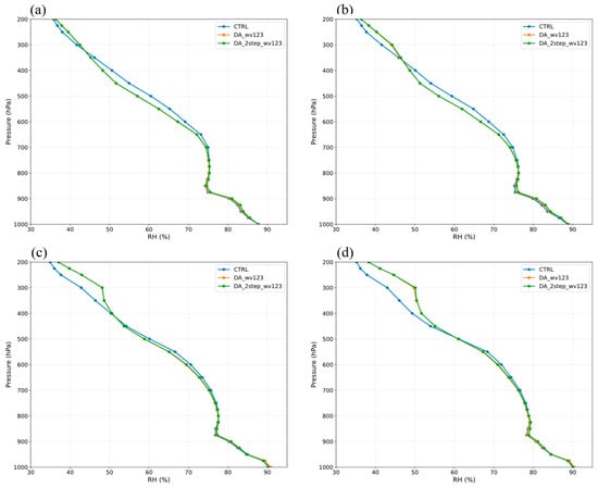 The domain-averaged vertical distributions of relative humidity from CTRL (blue), DA_wv123 (orange) and DA_2step_wv123 (green) at (a) 1200 UTC, (b) 1400 UTC, (c) 1600 UTC, and (d) 1800 UTC on 30 July 2023.