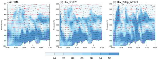 The vertical cross sections of the relative humidity (shaded, unit: %), equivalent potential temperature (red solid contours, unit: K), and meridional–vertical circulation (v and w × 5, vector, unit: m/s) of (a) CTRL, (b) DA_wv123, and (c) DA_2step_wv123 at 1200 UTC on 31 July 2023. The location of the cross-section is the Beijing precipitation center, about 115.89°E.