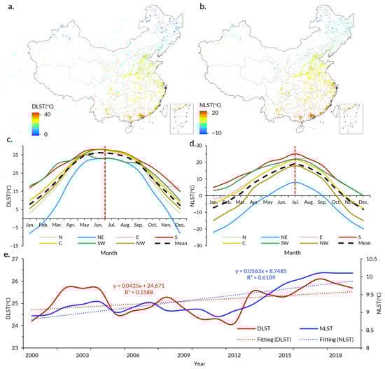 Temporally, urban LST data in China exhibit pronounced seasonal variability (Figure 2c). The DLST peaks in summer (June to August, 34.92 °C) and reaches its lowest values in winter (December to February, 6.81 °C). Although similar in patterns, the magnitude of DLST data varies regionally. For instance, Southern China consistently shows higher DLST values than Northern China. The NLST also demonstrates significant seasonal fluctuations, with higher values in summer (19.43 °C) and lower in winter (−9.17 °C, Figure 2d). Both the DLST and NLST reach their annual maxima in mid-June. From 2000 to 2019, the annual mean LST increased (Figure 2e). Notably, the long-term trends of DLST and NLST data differ, with the NLST exhibiting a more pronounced warming tendency.