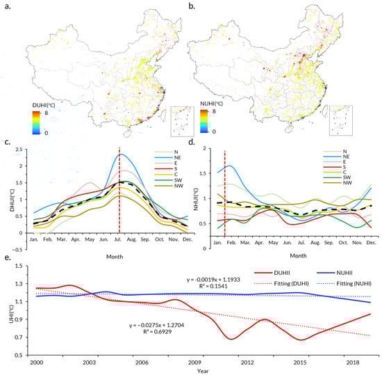 Temporal and spatial change of UHI in China between 2000–2019: (a) the spatial distribution of the average DUHI data in China; (b) the spatial distribution of the average NUHI data in China; (c) the monthly changes in DUHI in different regions; (d) the monthly changes in NUHI in different regions; (e) the annual change trends of DUHI and NUHI from 2000 to 2019. The red dashed lines in subfigures (c,d) represent the highest point positions of the corresponding LST.