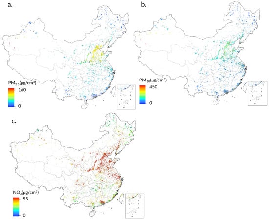 The spatial distributions of PM2.5, PM10, and NO2 across China during summer (June–August) exhibit pronounced regional heterogeneity. Elevated concentrations of PM2.5 and PM10 were predominantly clustered in Northwest and Northern China (Figure 4a,b). The northwestern hotspots, encompassing Kashgar, Hotan, Aksu, and Bayingolin, stem mainly from natural dust due to the arid climate and sparse vegetation. In contrast, northern and southwestern pollution comes from anthropogenic activities, including industrial emissions and fossil fuel combustion. NO2 hotspots are spread widely across Northern, Central, Eastern, and Southern China. Levels are especially high in cities such as Suzhou, Tangshan, Tianjin, Shanghai, and Wuxi (Figure 4c). Approximately 1.37% of cities exceeded the Grade II limit (40 μg/cm3) specified in China’s Ambient Air Quality Standards (GB 3095-2012) []. This NO2 pollution largely originated from fossil fuel combustion and vehicular emissions.