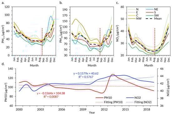 Changes in average air pollutants in China: (a–c) the monthly trends of changes in PM2.5, PM10, and NO2, respectively. (d). the yearly trends of changes in PM2.5 and PM10, respectively. The red dashed lines in subfigures (a–c) represent the lowest point positions of the corresponding LST.