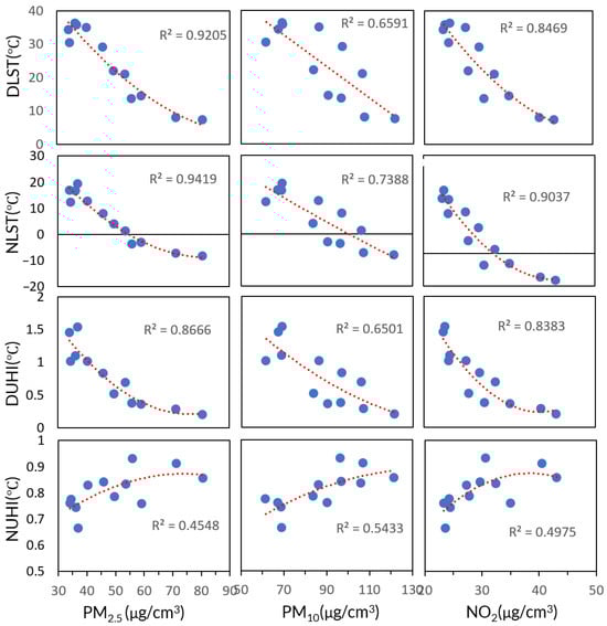 On a monthly climatological scale across the year, significant associations can be observed between air pollutants and the thermal environment (Figure 6). Both DLST and NLST levels decrease significantly with increasing concentrations of PM2.5, PM10, and NO2. PM2.5 shows the strongest coupling, with high coefficients of determination (R2 = 0.9205 for DLST and R2 = 0.9419 for NLST). The DUHI decreases with rising pollutant concentrations, most notably with PM2.5 (R2 = 0.8666), suggesting that elevated pollution levels attenuate the DUHI effect. In contrast, the NUHI shows a weak positive correlation with pollutants such as PM2.5 (R2 = 0.4548). These findings indicate that higher pollutant concentrations over the monthly cycle cool surface temperatures (DLST, NLST) and suppress the DUHI but slightly intensify the NUHI.
