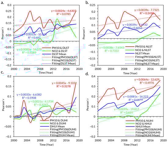 The interannual trend of correlation between the urban thermal environment and air pollutants in China during 2000–2019: (a) the trend of the correlation between air pollutants and DLST; (b) the trend of the correlation between air pollutants and NLST; (c) the trend of the correlation between air pollutants and DUHI; (d) the trend of the correlation between air pollutants and NUHI. The positive slopes of all trend lines are statistically significant (p < 0.05). The correlation between the thermal environment and pollutant environment gradually shifted from an insignificant correlation to significant correlation (p < 0.05), and all types of correlations after 2013 showed significance (p < 0.05).