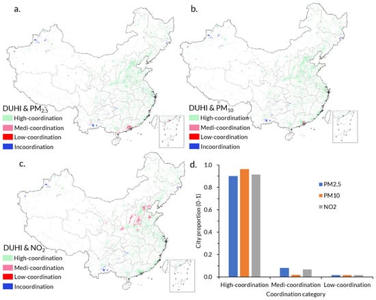 Spatial coupling of daytime urban heat pollution environment in China: (a) the spatial coupling between DUHI and PM2.5; (b) the spatial coupling between DUHI and PM10; (c) the spatial coupling between DUHI and NO2; (d) the proportion statistics of different coupling levels between DUHI and urban air pollutant concentrations.