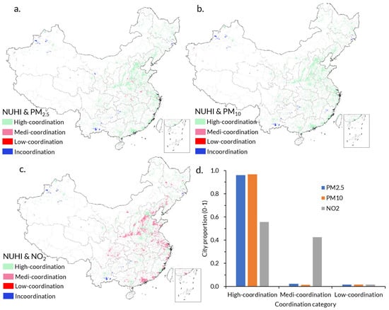 Spatial coupling of nighttime urban heat–pollution environment in China: (a) the spatial coupling between NUHI and PM2.5; (b) the spatial coupling between NUHI and PM10; (c) the spatial coupling between NUHI and NO2; (d) the proportion statistics of different coupling levels between NUHI and urban air pollutant concentrations.
