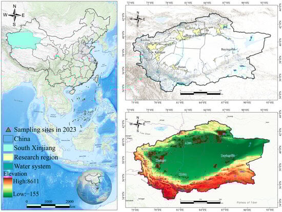Southern Xinjiang lies south of the Tianshan Mountains in China’s Xinjiang Uygur Autonomous Region. The terrain slopes from surrounding mountains toward the Tarim Basin, forming a distinct “mountain–oasis–desert” transition zone. The region is extremely arid, with annual precipitation typically below 200 mm and potential evaporation exceeding 2000 mm. Water resources mainly originate from glacial and snowmelt in the Tianshan, Kunlun, and Altun Mountains, feeding the Tarim River and its tributaries that sustain agriculture and ecological stability in the oases [29]. The study focuses on the oasis zones of southern Xinjiang, distributed across piedmont alluvial fans, fluvial plains, and basin margins, where loam- and sand-dominated soils prevail [30]. Intense evaporation and extensive irrigation diversion have led to severe soil salinization in some locations. The extent of the study region and sampling sites is shown in Figure 1.