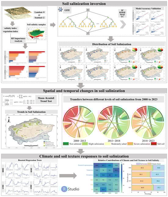 (3) The BRT model quantified the relative contributions of environmental drivers, showing that climatic factors consistently acted as the dominant drivers, with their contribution increasing from 65.2% in 2008 to 66.8% in 2023. The influence of potential evapotranspiration weakened, whereas the roles of temperature and precipitation became increasingly prominent. Among soil texture variables, silt and sand contents exerted significant effects on salinity accumulation under specific thresholds.