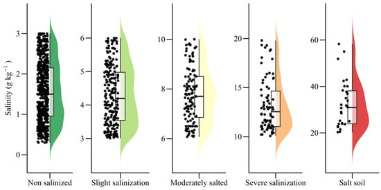 To characterize the spatial distribution and variability of soil salinity in 2023, salinization levels were classified according to the Xinjiang Agricultural Technical Manual [60] (Table 3), and descriptive statistics were performed for each class (Table 4; Figure 3). In non-salinized soils, SSC ranged from 0.30 to 3.00 g·kg−1 with a mean of 1.55 g·kg−1, and the high coefficient of variation (CV) of 47.61% indicated substantial spatial heterogeneity despite low overall salinity. Mildly salinized soils had a mean of 4.29 g·kg−1 with a standard deviation of 0.87 g·kg−1, and the CV dropped to 20.34%, reflecting more stable conditions. Moderate salinization showed SSC values between 6.07 and 10.00 g·kg−1, averaging 7.75 g·kg−1 with a CV of 14.03%, suggesting a more concentrated distribution. In severely salinized soils, the mean rose to 13.21 g·kg−1, with values up to 19.80 g·kg−1, and variability increased, indicating marked salt accumulation and strong ecological stress. Salt-affected soils displayed the highest salinity, ranging from 20.30 to 58.30 g·kg−1, with a mean of 32.41 g·kg−1, a standard deviation of 10.32 g·kg−1, and a CV of 31.85%, representing typical features of both high salt content and strong variability, and constituting a major risk type of soil degradation in the region.