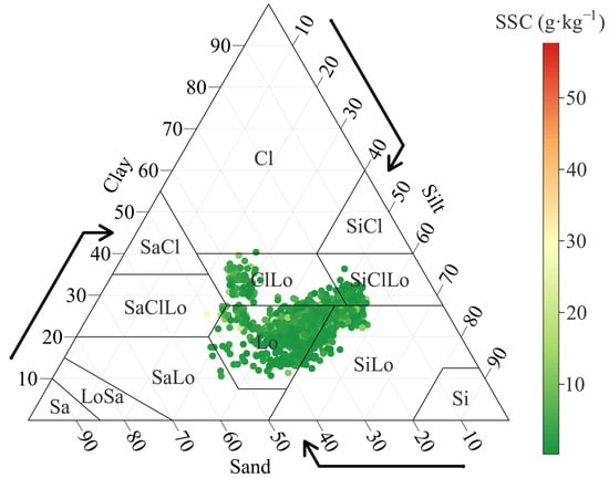 The sampling points in this study were primarily concentrated in the loam (Lo)–silt loam (SiLo)–silty clay loam (SiCLo) region of the USDA soil texture triangle (Figure 4). This distribution exhibited a transitional pattern from medium sand fractions toward higher silt and clay contents. Sampling points with extreme textures—pure sand (Sa), silt (Si), and clay (Cl)—were relatively scarce, indicating that the study area is dominated by medium-textured soils with relatively limited diversity. At the same time, SSC still exhibited considerable variability within the same texture class, suggesting that soil texture is not the sole controlling factor of salinity; climatic conditions, hydrological processes, topography, and cultivation practices may also interact to shape soil salinity patterns. The soil texture data were obtained from the SoilGrids dataset, which provides globally harmonized estimates of clay, silt, and sand fractions and is widely used in regional-scale studies.