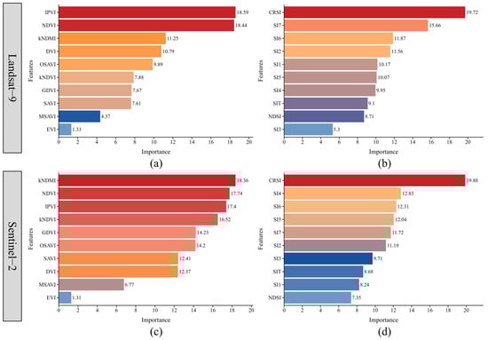 Distribution Variable importance rankings of vegetation and salinity indices derived from Random Forest models using Landsat-9 and Sentinel-2 data. (a) Importance ranking of vegetation indices derived from Landsat-9 imagery; (b) salinity indices derived from Landsat-9 imagery; (c) vegetation indices derived from Sentinel-2 imagery; (d) salinity indices derived from Sentinel-2 imagery.