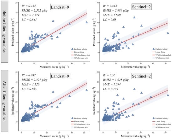 Under the full-variable input condition, the Landsat-9 model achieved higher fitting accuracy and consistency (R2 = 0.734, RMSE = 2.552 g·kg−1, LC = 0.847) than Sentinel-2 (R2 = 0.515, RMSE = 2.989 g·kg−1, LC = 0.680). After feature selection, the overall model performance improved, confirming the potential disruptive effect of redundant variables on model stability. With the optimized variable set, the R2 of the Landsat-9 model increased to 0.747 and the LC rose to 0.855, indicating stronger fitting capability and trend consistency. The Sentinel-2 model also improved, with R2 increasing to 0.550 and LC rising to 0.709. Although the RMSE changed only marginally, the overall fitting trend became more consistent (see Figure 6). Overall, the Landsat-9 model demonstrated higher predictive accuracy than Sentinel-2, particularly showing greater sensitivity in high-salinity areas. Feature selection not only enhanced model accuracy and stability but also improved structural parsimony and interpretability. These findings highlight the importance of selecting appropriate feature variables and sensor-specific strategies to improve the accuracy and reliability of soil salinization inversion in arid regions.