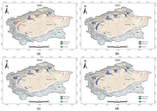Spatial distribution of SSC from 2008 to 2023: (a) 2008; (b) 2013; (c) 2018; (d) 2023.