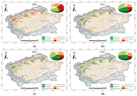 Proportional distribution of soil salinization classes from 2008 to 2023: (a) 2008; (b) 2013; (c) 2018; (d) 2023.