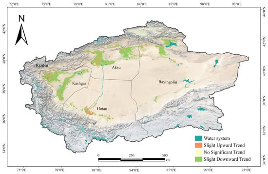 To comprehensively reveal the spatiotemporal evolution of soil salinity in the southern Xinjiang oasis and its statistical significance, this study applied Sen’s slope estimation in combination with the non-parametric MK test to detect trends in the four reconstructed datasets (2008, 2013, 2018, and 2023), as shown in Figure 9. The results indicated an overall decreasing trend in soil salinity across the region, with slight declines accounting for as much as 78.63%, suggesting that salinization has been alleviated in most areas over the past 15 years. Areas with no significant change were relatively scarce, accounting for only 2.53%. Notably, approximately 18.84% of the region exhibited a slight upward trend, indicating potential risks in water–salt regulation; these areas should be prioritized for targeted management in the future.