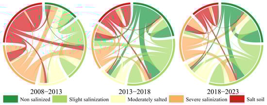 According to the soil salinization transition matrix from 2008 to 2023 (Figure 10), the evolutionary trajectory and improvement effects of soil salinization in the study area are clearly revealed. During 2008–2013, 15.41% of saline soils remained unchanged, while 8.24% shifted to severe salinization, 4.31% declined to slight salinization, and 2.18% successfully converted into non-salinized soils. Meanwhile, 6.30% of severely salinized areas transitioned to non-salinized status, and 8.78% shifted toward slight salinization. From 2013 to 2018, identified as a period of accelerated remediation, 9.13% of non-salinized soils remained stable, while 9.66% of slightly salinized soils and 1.13% of saline soils were successfully converted to non-salinized status, indicating the progressive effectiveness of integrated remediation measures. During 2018–2023, the remediation trend became more pronounced, with 11.65% of slightly salinized soils successfully converted to non-salinized status, demonstrating that recent remediation practices were more effective than those in earlier periods. However, fluctuations between saline soils and moderately salinized soils persisted, highlighting the need for sustained remediation efforts and region-specific management strategies.