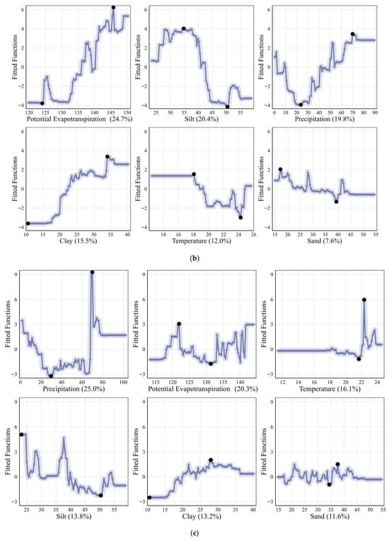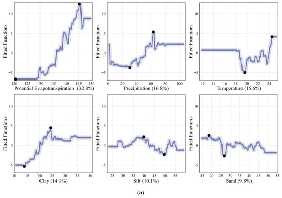 Boosted Regression Trees (BRT) are an ensemble modeling approach that integrates Classification and Regression Trees (CART) with boosting algorithms [56]. The algorithm sequentially builds multiple weak regression trees, with each iteration fitting the residuals of the previous model, thereby progressively enhancing overall predictive accuracy and stability [57]. During model construction, BRT dynamically evaluates the importance of explanatory variables, making it suitable for identifying dominant factors influencing the response variable. Compared with traditional regression methods, BRT demonstrates superior ability to capture nonlinear relationships, characterize complex interactions among variables, and enhance model generalization while mitigating overfitting risks. In this study, the BRT model was employed to establish the response relationships between soil salt content, climatic factors, and soil texture properties, and to further quantify the relative contributions of each environmental factor. Model construction was implemented in R using the “dismo” and “gbm” packages, with parameter ranges including a learning rate of 0.001–0.1 and tree complexity of 1–10. The final model parameters were set as follows: learning rate = 0.01, bag fraction = 0.5, and tree complexity = 5. The model exhibited strong performance in both predictive accuracy and explanatory capacity.