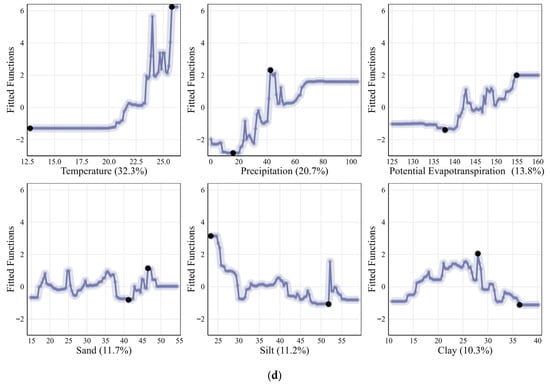 Relative contributions and partial dependence plots of climate factors and soil texture on soil salinization in southern Xinjiang. (a) 2008; (b) 2013; (c) 2018; (d) 2023.