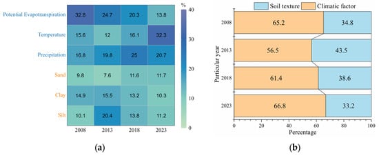 As shown in Figure 12, from 2008 to 2023, the driving effect of climate factors on soil salinization consistently exceeded that of soil texture. In 2008, climate factors contributed 65.2%, while soil texture accounted for 34.8%; by 2023, the contribution of climate factors increased to 66.8%, whereas soil texture decreased to 33.2%. Specifically, potential evapotranspiration exerted the greatest influence on salinity accumulation in 2008, contributing 32.8%, but gradually declined to 13.8% by 2023. In contrast, the effects of temperature and precipitation on salinization increased annually, rising from 15.6% and 16.8% in 2008 to 32.3% and 20.7% in 2023, respectively. Overall, the contribution of climate factors remained consistently higher than that of soil texture, with temperature emerging as the most critical and increasingly dominant driver of soil salinization.
