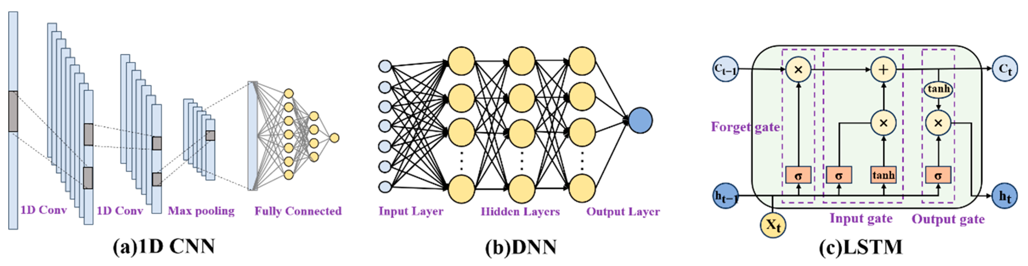 LSTM improve recurrent neural networks (RNNs) by using gating mechanisms and memory cells to capture long-term dependencies in sequential data [75]. The LSTM architecture includes two hidden layers, with 64 and 32 units, respectively, and applies Sigmoid and Tanh activation functions. Dropout layers with a 50% rate were added after each hidden layer to further reduce overfitting. Training used the Adam optimizer [76] with an MSE loss function, an initial learning rate of 0.001, and a maximum of 100 epochs. Figure 3 illustrates the architectures of the deep learning models, where input variables were standardized.