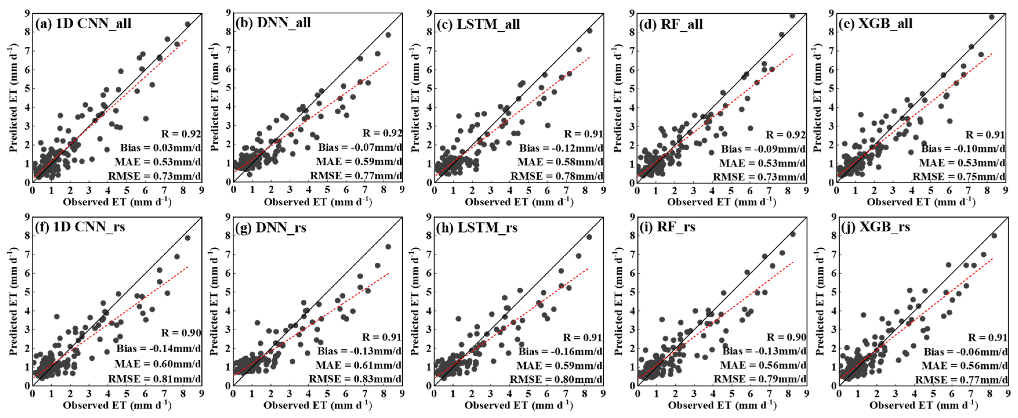Figure 8 presents the performance of different models on the test set. The RMSE values for the models 1DCNN_all, 1DCNN_rs, DNN_all, DNN_rs, LSTM_all, LSTM_rs, RF_all, RF_rs, XGB_all, and XGB_rs are 0.73 mm/d, 0.81 mm/d, 0.77 mm/d, 0.83 mm/d, 0.78 mm/d, 0.80 mm/d, 0.73 mm/d, 0.79 mm/d, 0.75 mm/d, and 0.77 mm/d, respectively. All models achieved an R value exceeding 0.9. Among these, the 1DCNN_all model exhibited the best performance, with lower Bias and MAE values. For the same type of model, incorporating meteorological data improved accuracy. Overall, the predictions from all models showed strong consistency with the test set, with data distributions closely aligned with the 1:1 line, demonstrating robust model performance.