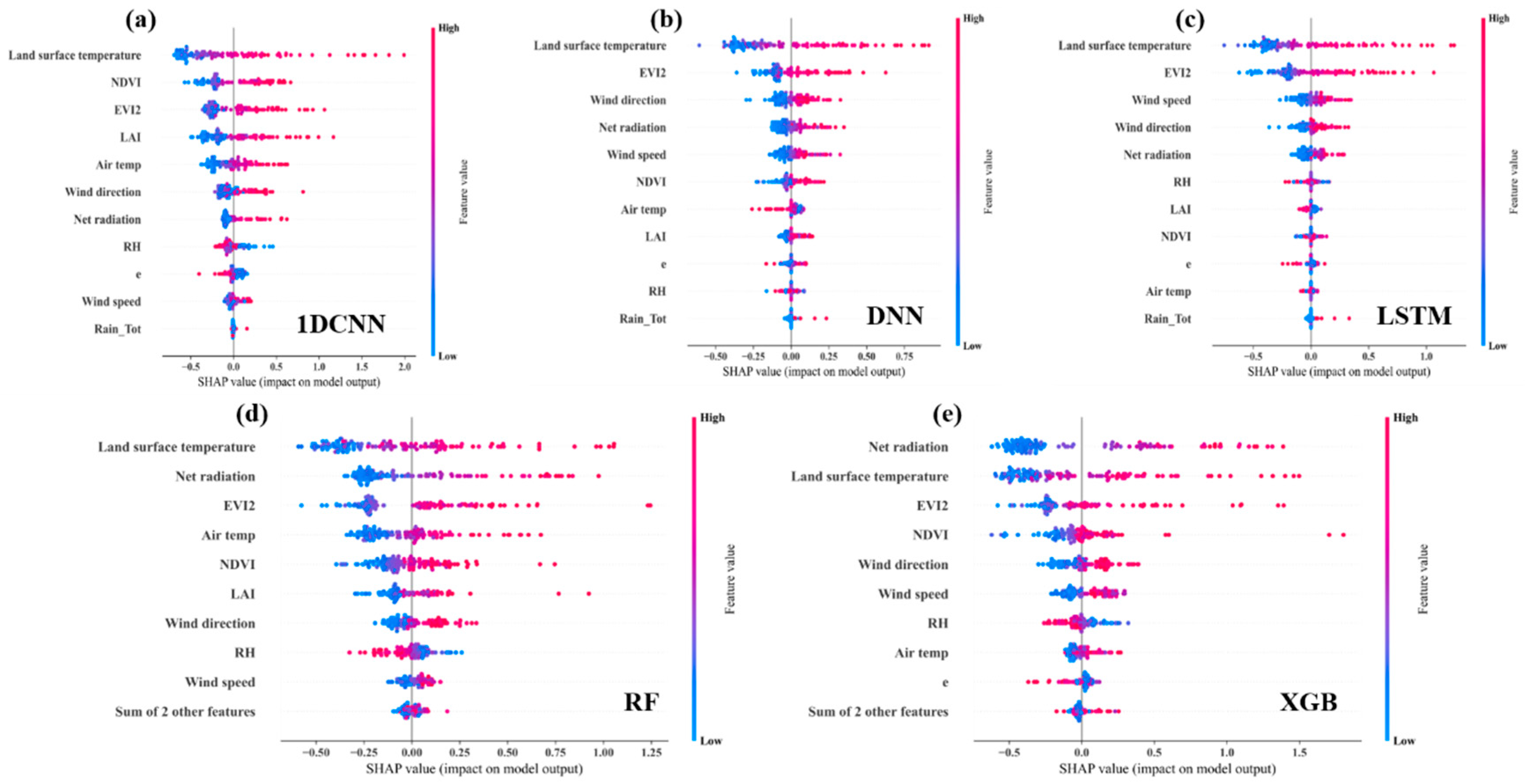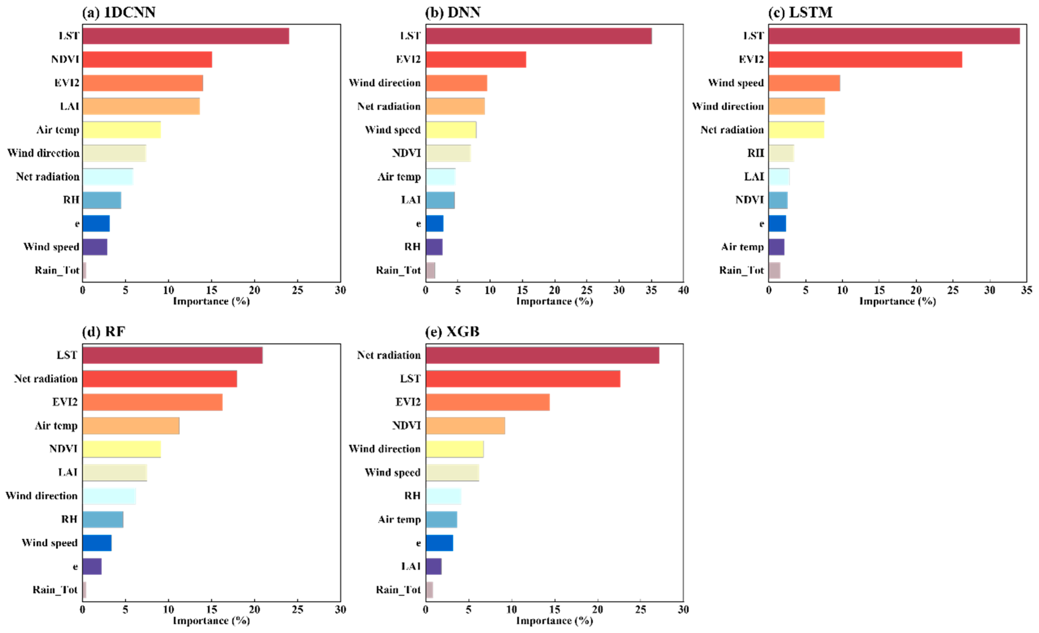 The results indicate that higher values of LST, EVI2, LAI, NDVI, Ta, Rn, and Ws are associated with increased ET predictions. Conversely, higher RH and e are associated with decreased ET predictions, aligning with the established driving mechanisms of ET. Notably, Wd greater than 180° results in higher ET predictions, as the underlying surface is predominantly farmland. In contrast, smaller Wd correspond to underlying surfaces that include buildings and roads. Furthermore, the five algorithms demonstrated limited sensitivity to precipitation events, likely due to the small number of precipitation events in the training data. Figure 10 illustrates the relative importance of predictors across the five algorithms. While ET is strongly influenced by meteorological conditions, the importance of remote sensing data is evident in all algorithms. In the 1D CNN, DNN, LSTM, RF, and XGB algorithms, the combined importance of the four remote sensing factors accounts for 66.7%, 62.1%, 65.7%, 53.9%, and 48.1%, respectively. Among all models, LST and EVI2 consistently rank among the top three predictors, regardless of the order, with respective contributions of 38%, 50.1%, 60.3%, 37.2%, and 37%. For the 1D CNN algorithm, Ta emerges as the most important meteorological factor, contributing 9.1%. In the DNN algorithm, Wd and Rn are the most critical meteorological factors, collectively accounting for 18.7%. In the LSTM algorithm, Ws and Wd are identified as the most critical meteorological predictors, highlighting the model’s sensitivity to the heterogeneity of the underlying surface. For the RF and XGB algorithms, the relative importance of meteorological factors is nearly equivalent to that of remote sensing factors, with net radiation identified as the most significant meteorological predictor, contributing 17.9% and 27.1%, respectively.