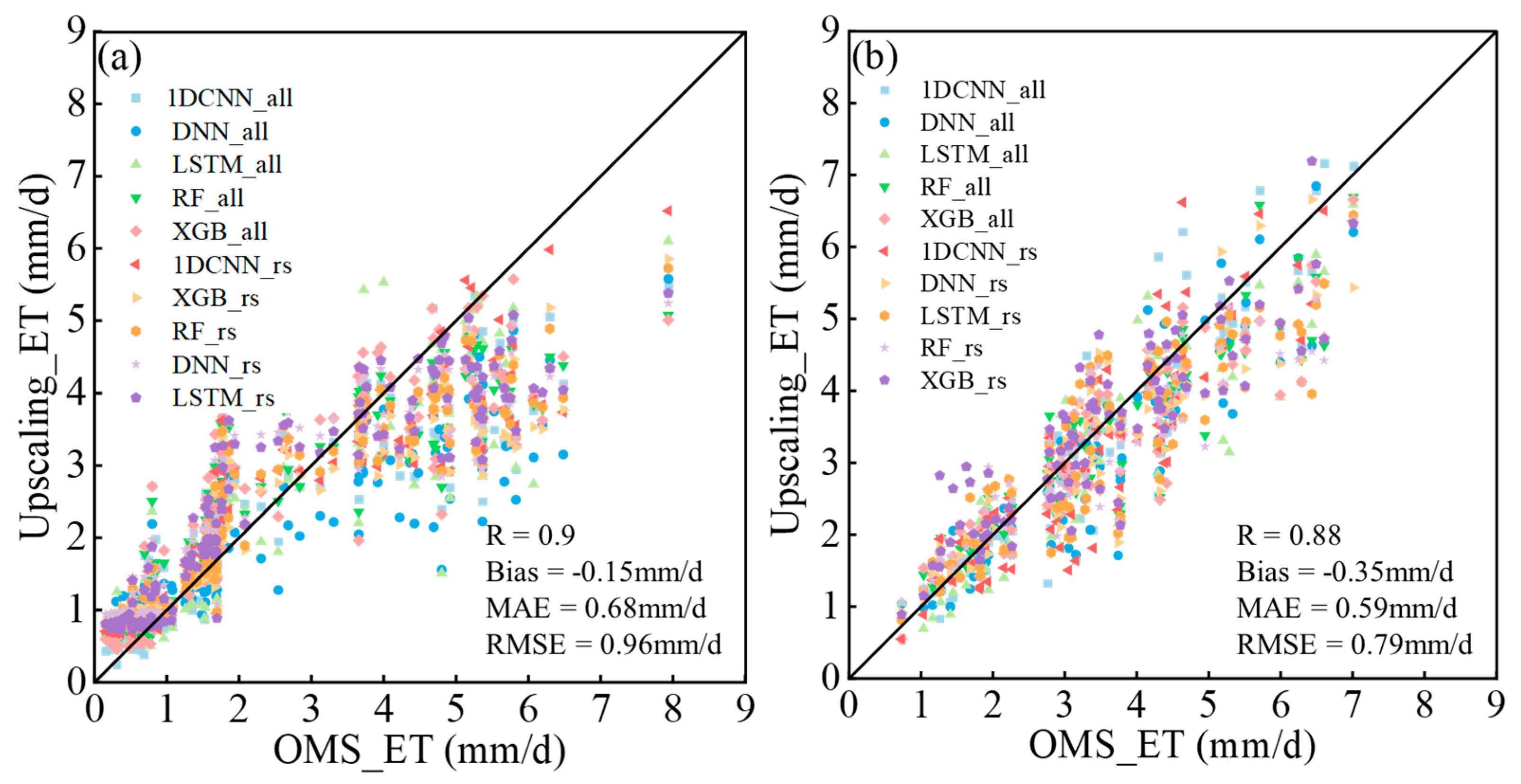For the more homogeneous farmland surface, Upscaling_ET demonstrated higher accuracy and generally outperformed results from the urban-agricultural mixed surface. This improvement can be attributed to the reduced impact of surface heterogeneity. Models that incorporated both remote sensing and meteorological data consistently performed better than those relying solely on remote sensing data. For instance, in the RF model, adding meteorological data reduced the RMSE by up to 0.07 mm/d. Overall, all methods exhibited good agreement with OMS_ET. Among the models, 1D CNN_all and RF_all achieved the best performance, with RMSE (MAE, R) values of 0.66 mm/d (0.46 mm/d, 0.90) and 0.68 mm/d (0.48 mm/d, 0.90), respectively, but 1D CNN_all showed slightly better results with lower RMSE and Bias. Following these, the next best-performing models were XGB_all, XGB_rs, 1D CNN_rs, LSTM_all, RF_rs, DNN_all, and DNN_rs, with corresponding RMSE (MAE, R) values of 0.70 mm/d (0.52 mm/d, 0.88), 0.70 mm/d (0.55 mm/d, 0.88), 0.72 mm/d (0.56 mm/d, 0.91), 0.74 mm/d (0.56 mm/d, 0.86), 0.75 mm/d (0.56 mm/d, 0.87), 0.76 mm/d (0.58 mm/d, 0.87), and 0.75 mm/d (0.59 mm/d, 0.89), respectively. The LSTM_rs model performed the worst, with RMSE (MAE, R) values of 0.78 mm/d (0.62 mm/d, 0.86).