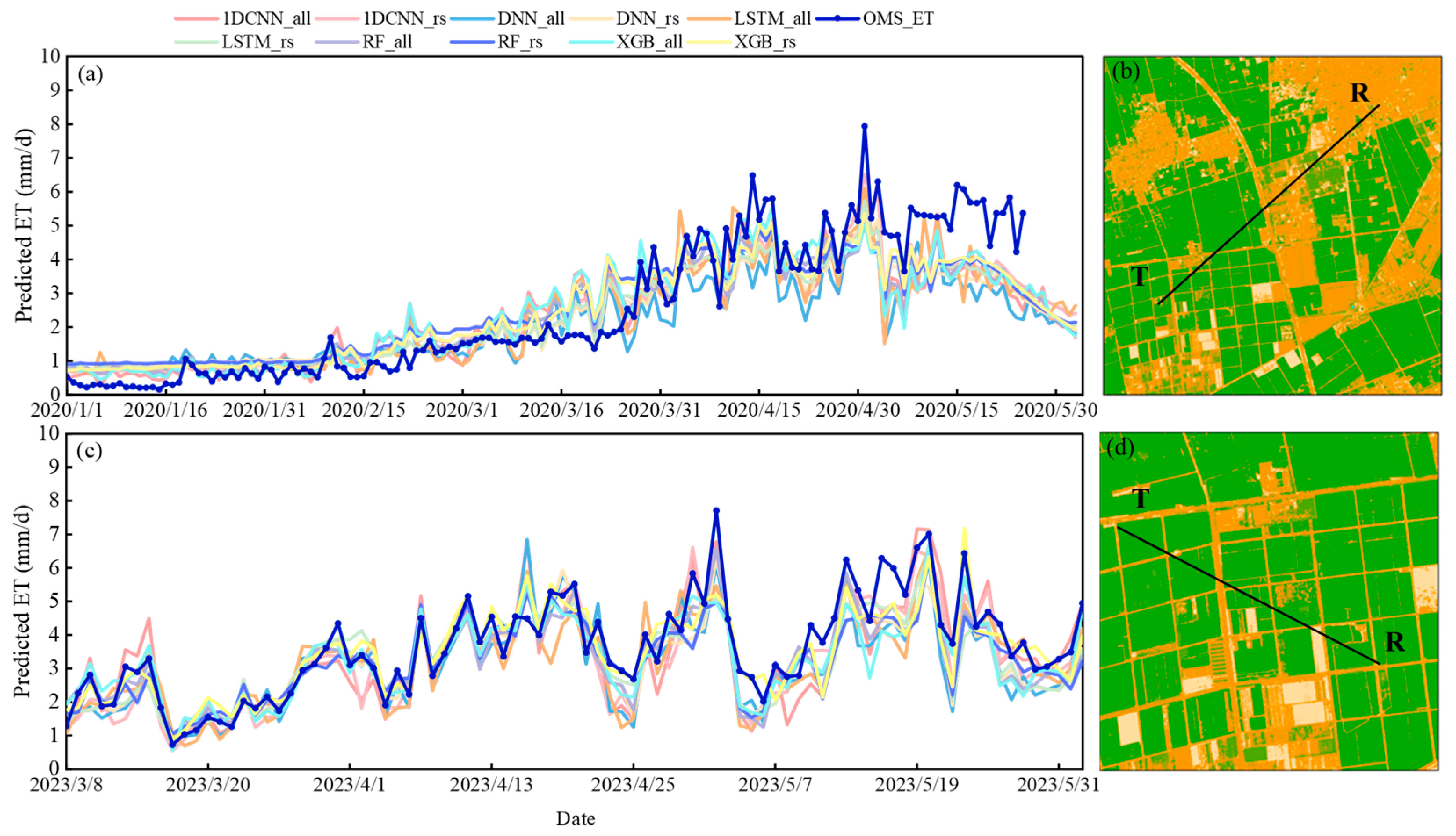 We further analyzed the temporal variation in Upscaling_ET and OMS_ET (Figure 12), and the two exhibited overall consistency in their temporal trends. However, discrepancies in ET variation were noted during the periods of 10–26 March and 1–14 May 2020. These differences primarily arose from the inconsistencies between OMS_ET and EC_ET, including variations in observation footprint areas (Figure 1d) and crop growth stages. Specifically, in the EC footprint, winter wheat is sown earlier, grows relatively faster, and has a later harvest period, whereas the growth stages in the OMS footprint area are not fully synchronized. Consequently, during periods of rapid ET changes, the two observations show obvious differences. Models trained using EC_ET as the response variable inherit these differences (Figure 13), leading to discrepancies between Upscaling_ET and OMS_ET. Overall, for the highly heterogeneous urban-agricultural mixed surface, the 1D CNN_rs demonstrated the best performance. In contrast, for the more homogeneous farmland surface, the 1D CNN_all achieved the best results.