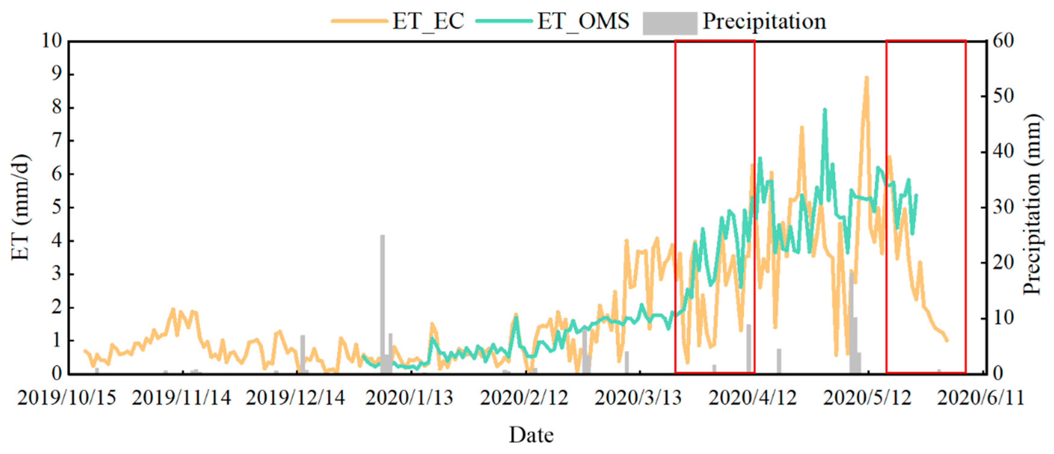 Figure 13. Comparison of EC_ET and OMS_ET in 2019. The red boxes indicate periods with significant differences between EC_ET and OMS_ET.