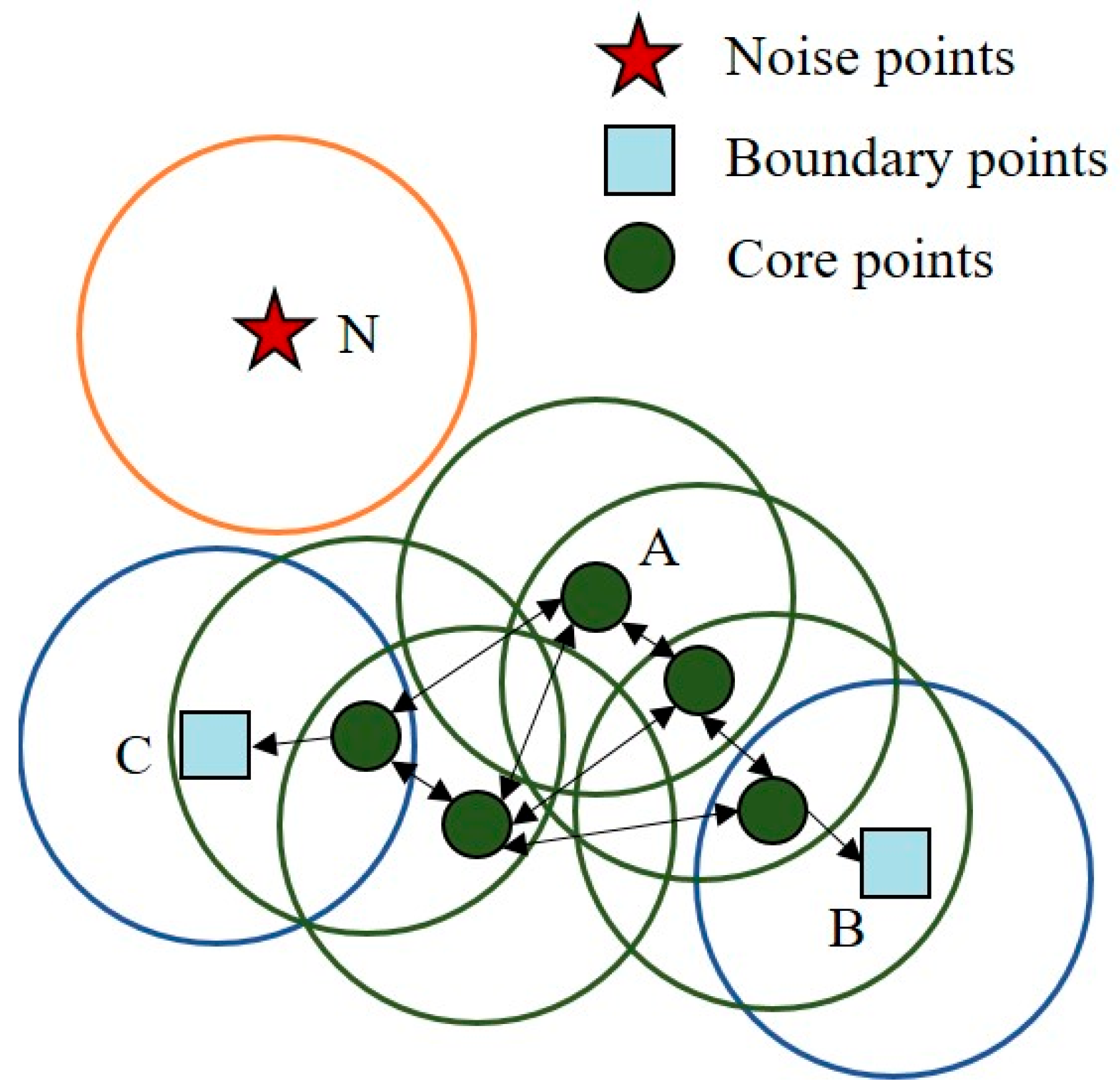 - Ester, M.; Kriegel, H.-P.; Sander, J.; Xu, X. A density-based algorithm for discovering clusters in large spatial databases with noise. In Proceedings of the KDD-96, Munich, Germany, 12–15 August 1996; pp. 226–231. [Google Scholar]