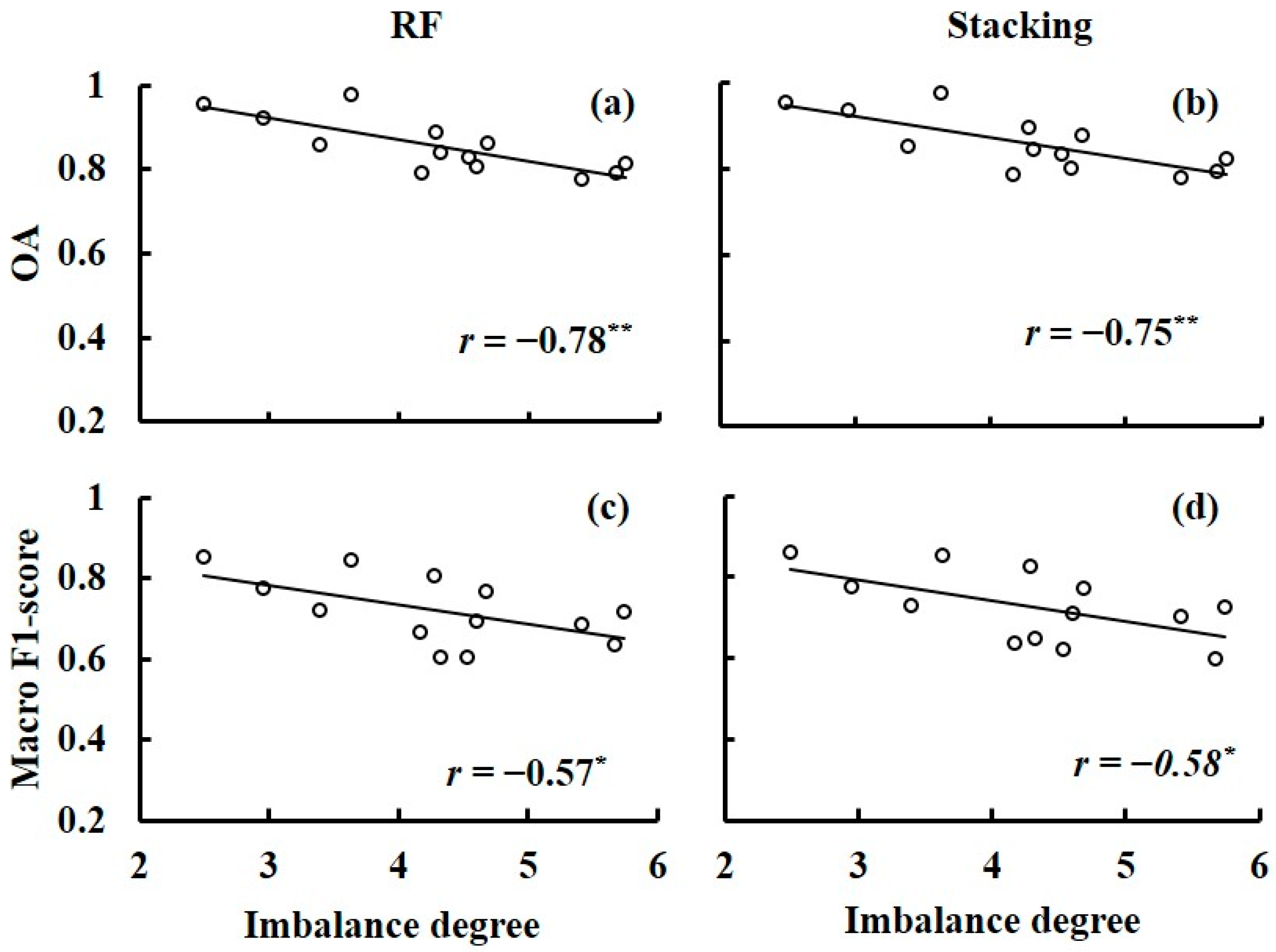 - Xiao, Y.; Huang, J.; Weng, W.; Huang, R.; Shao, Q.; Zhou, C.; Li, S. Class imbalance: A crucial factor affecting the performance of tea plantations mapping by machine learning. Int. J. Appl. Earth Obs. Geoinf. 2024, 129, 103849. [Google Scholar] [CrossRef]