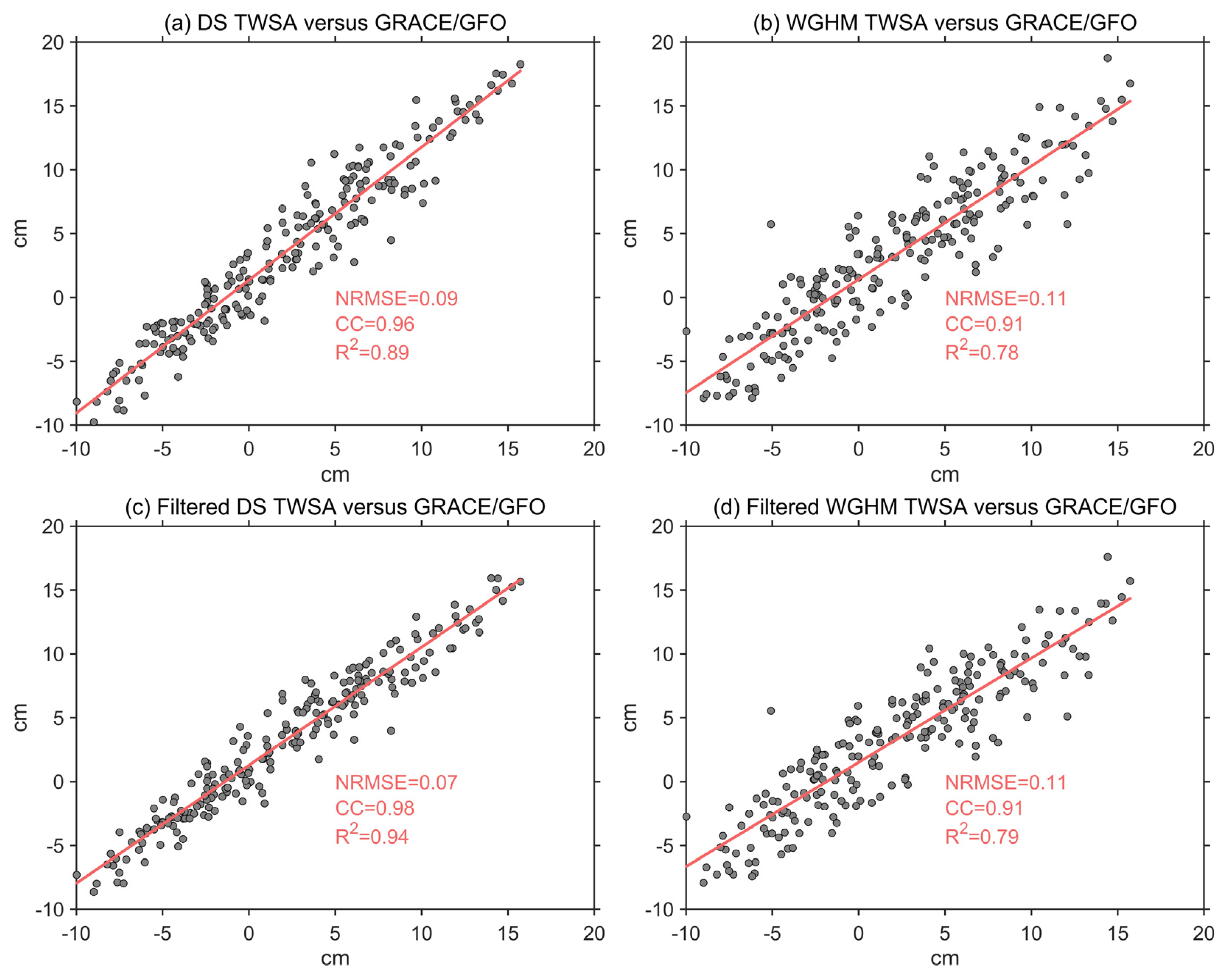Figure 2. Comparison of basin-averaged TWSA in the PRB: (a) downscaled (DS), (b) WGHM-simulated, (c) DDK3-filtered DS, and (d) DDK3-filtered WGHM-simulated TWSA (Y-axis) versus GRACE/GFO observations (X-axis).