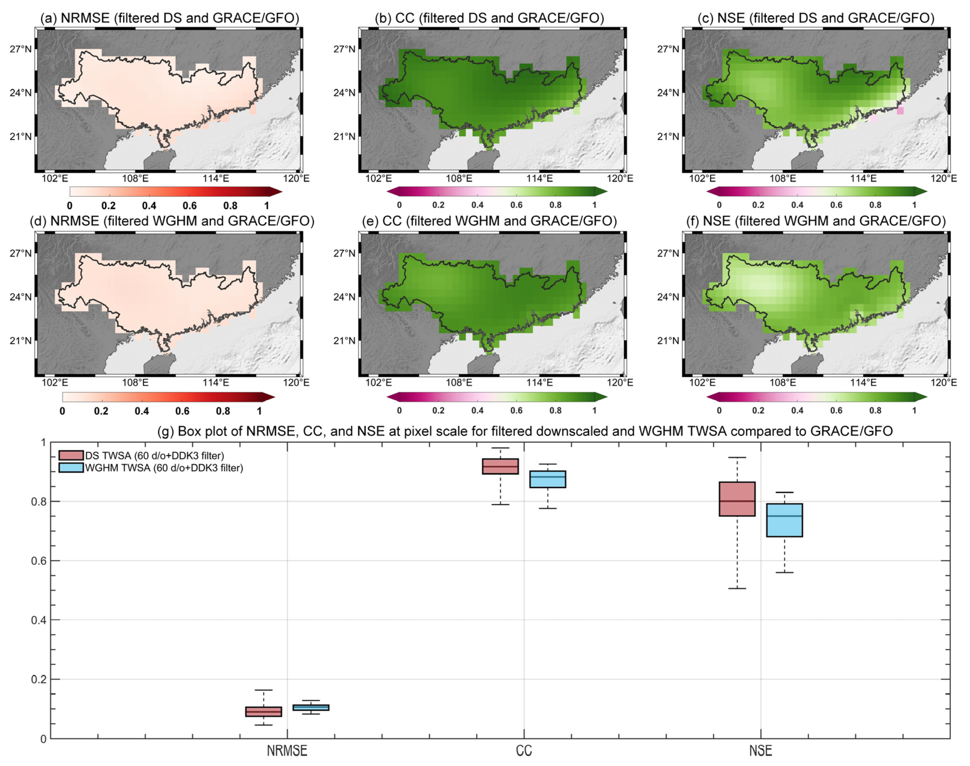 Figure 3. Spatial distributions of (a) NRMSE, (b) CC, (c) NSE between the filtered DS TWSA and GRACE/GFO observations, and (df) the corresponding metrics between the filtered WGHM TWSA and GRACE/GFO observations in the PRB. Box plots in (g) summarize the pixel−wise statistics for all three metrics.