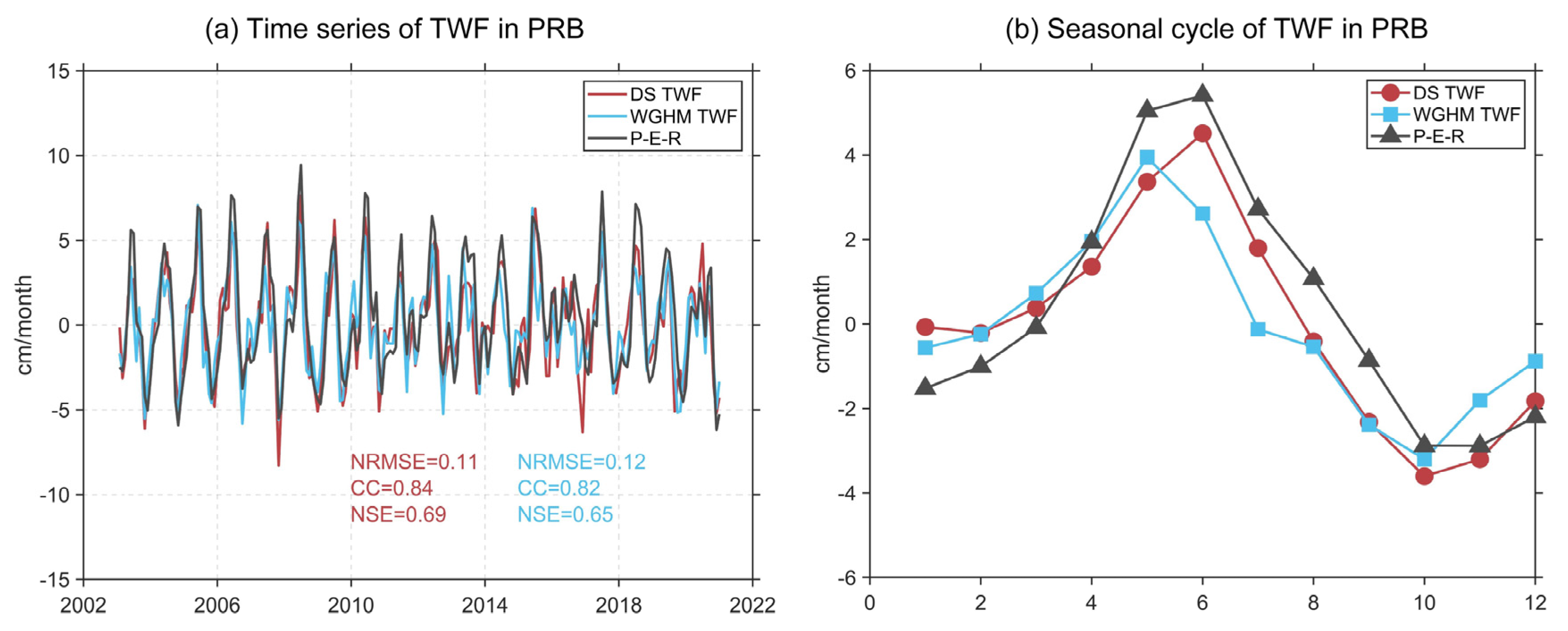 Figure 5. (a) Time series of TWF in the PRB derived from the downscaled (DS), WGHM, and independent water balance estimates (P-E-R). (b) Mean seasonal cycle of TWF over the period 2003−2020.
