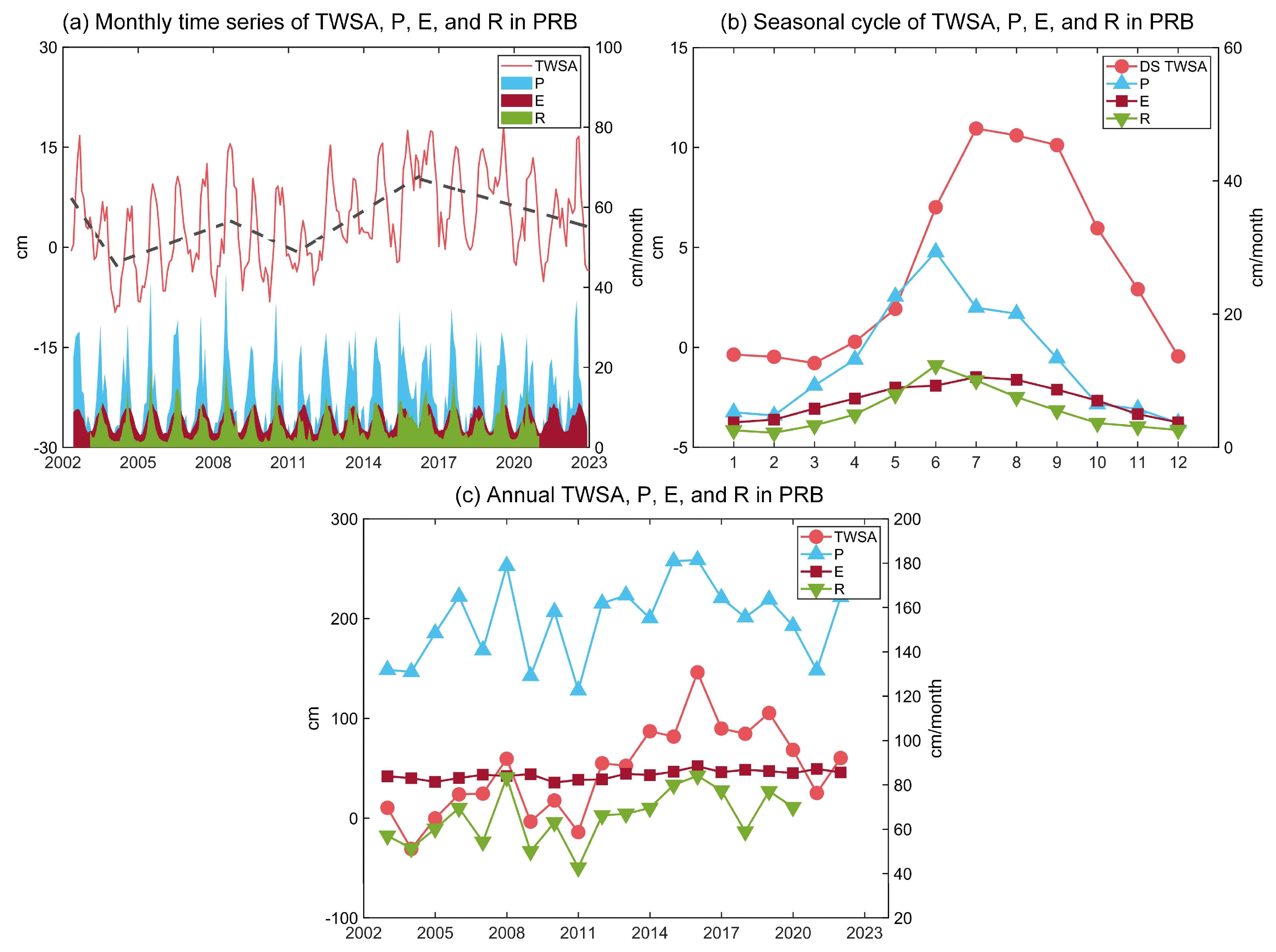 Figure 6. (a) Monthly time series of TWSA, P, E, and R. The period is from April 2002 to December 2022 for TWSA, P, and E, and from January 2003 to December 2020 for R. (b) Seasonal cycles and (c) annual variations of the four variables. The left y-axis refers to TWSA, and the right y-axis to P, E, and R.
