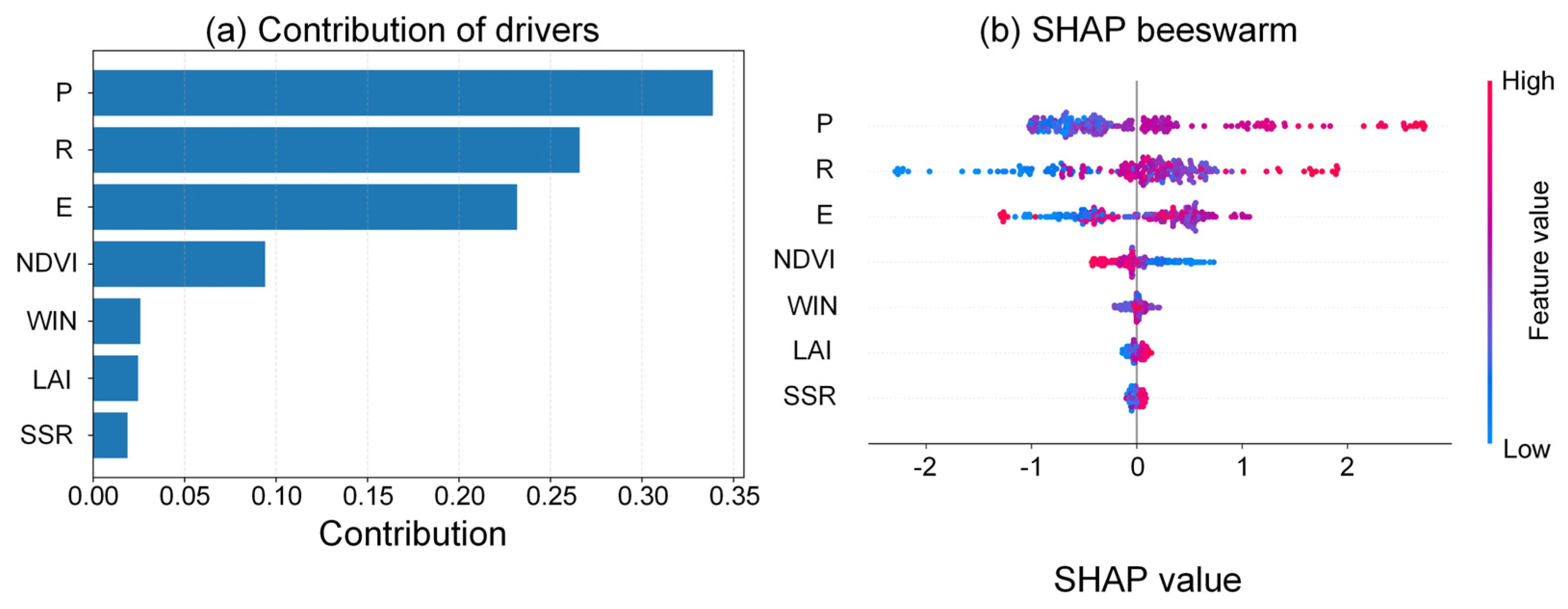 Figure 8. (a) Contributions of individual driving factors to TWSA and (b) corresponding SHAP values in the PRB at the basin scale.