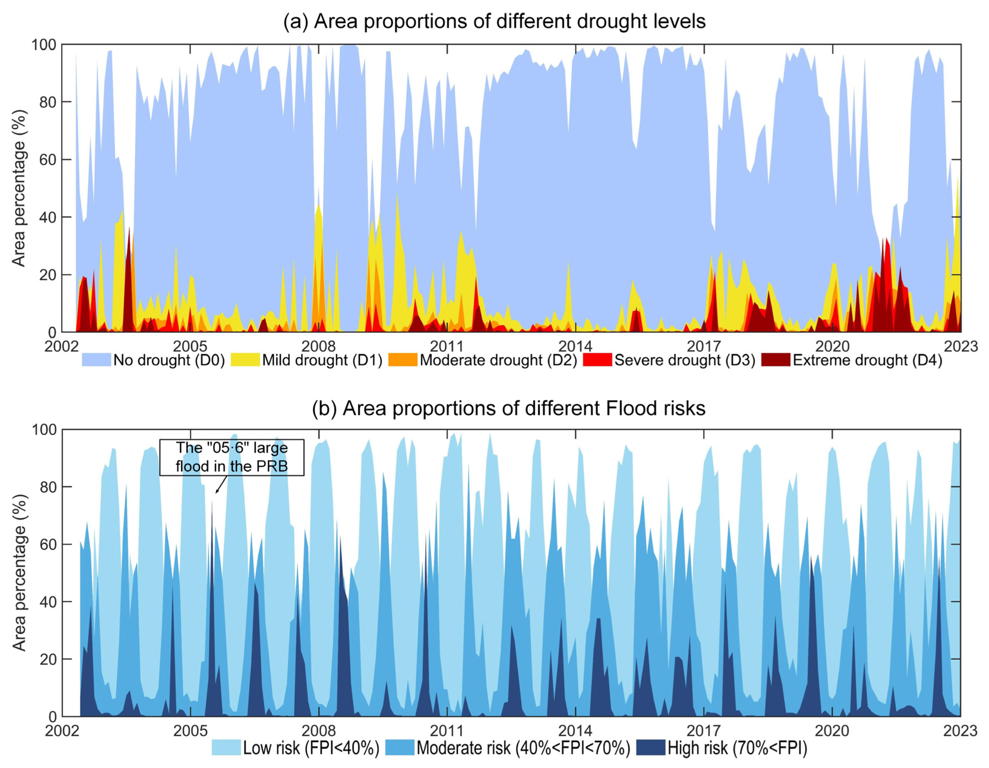 We examined the monthly area proportions of different drought and flood-risk categories in the PRB over April 2002 to December 2022, as shown in Figure 9. Distinct colors denote different drought levels and flood risk classes. The results indicate alternating occurrence of drought and flood events in the basin, with flooding occurring more frequently than drought. Droughts tend to manifest during low precipitation periods, whereas floods more often occur during high precipitation months (e.g., from June to August).
