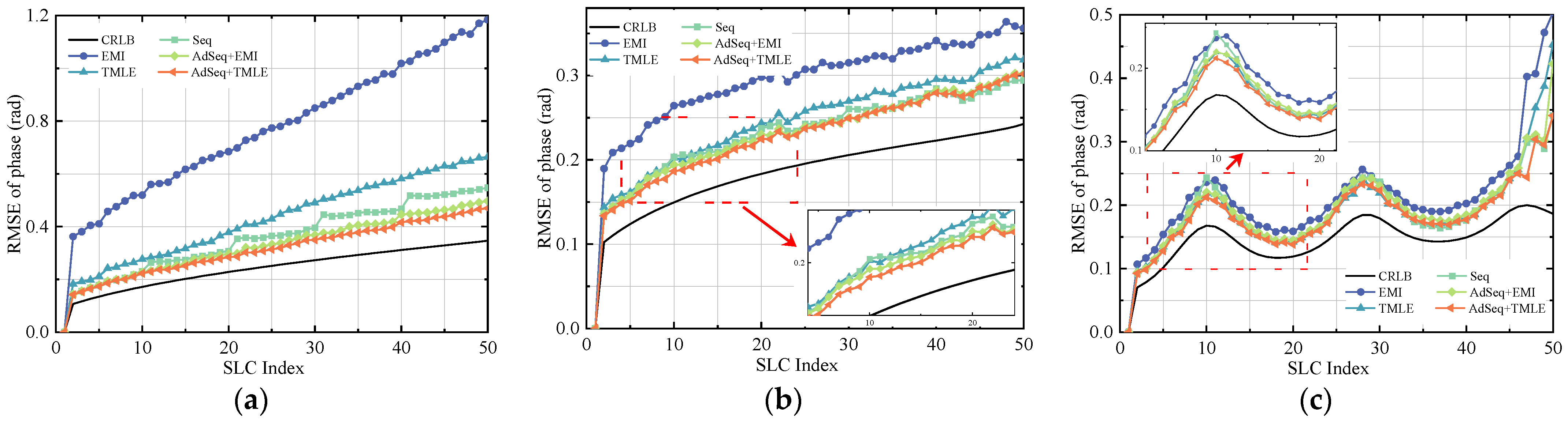 Figure 4b, the coherence maintains a minimum level of approximately 0.1 even when the temporal baseline becomes considerably extended. As a result, the CRLB of the RMSE for the optimized phase at the longest temporal baseline is only 0.24 rad. This characteristic indicates that, in contrast to the short-term coherence model, the long-term model provides a more stable interferometric environment, allowing all phase optimization methods to achieve enhanced performance. Among them, EMI exhibits the most noticeable improvement, with the maximum RMSE of the optimized phase reaching approximately 0.36 rad and the mean value about 0.30 rad. However, its overall optimization performance still remains the poorest compared to the other methods. TMLE performs better than EMI, yet the optimization performance decreases markedly under long temporal baselines compared to the Seq and AdSeq methods. And, the mean RMSE corresponding to TMLE stabilizes about 0.25 rad. In contrast, Seq, AdSeq + EMI, and AdSeq + TMLE methods deliver similar optimization results, all significantly outperforming EMI and TMLE. Their corresponding mean RMSE are about 0.24 rad, 0.24 rad, and 0.23 rad, respectively. A closer inspection of the locally enlarged region reveals that at shorter temporal baselines, the optimization performance of AdSeq is slightly superior to that of Seq, especially the AdSeq + TMLE method. As the temporal baseline increases, the performances of Seq, AdSeq + EMI, and AdSeq + TMLE gradually converge, exhibiting nearly identical accuracy levels.