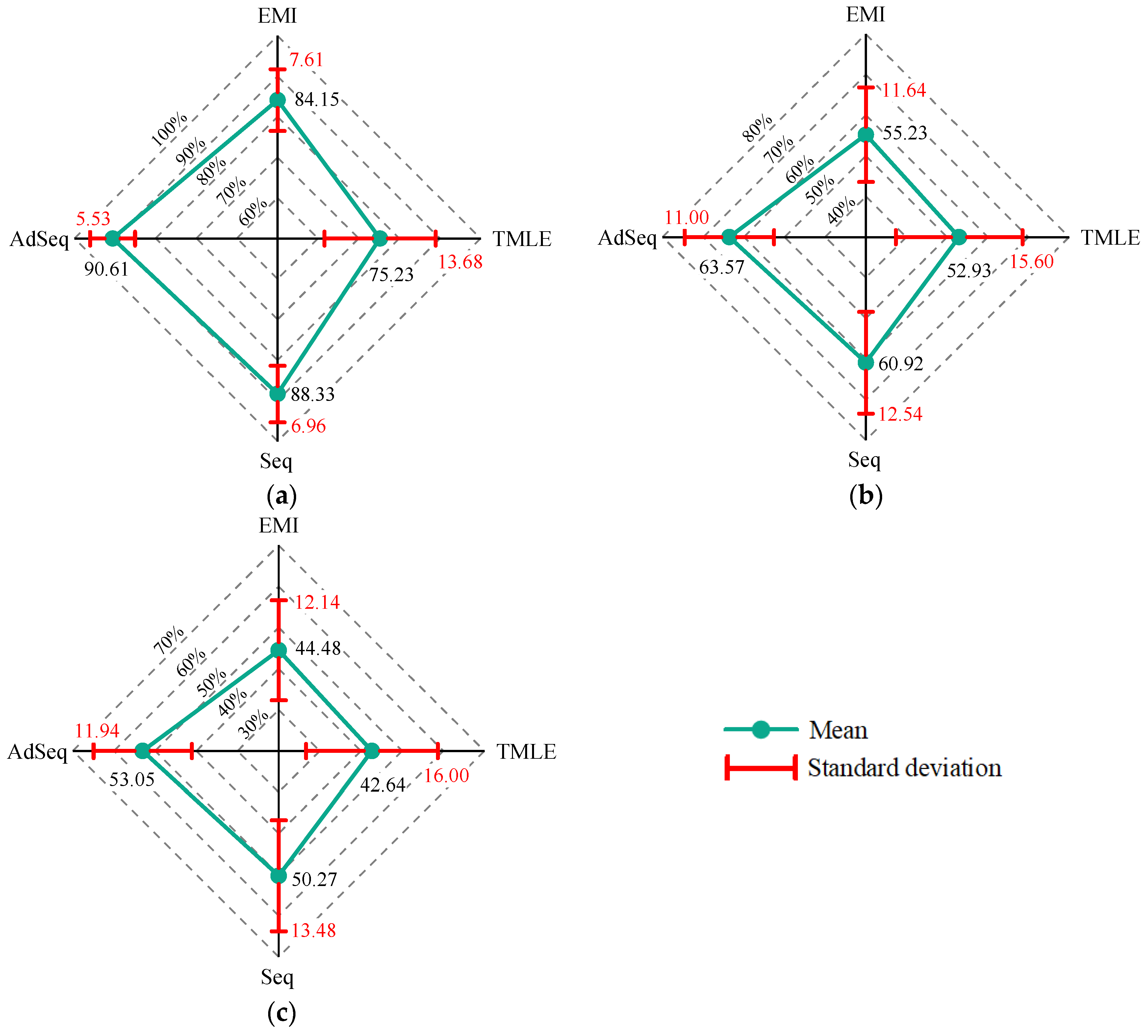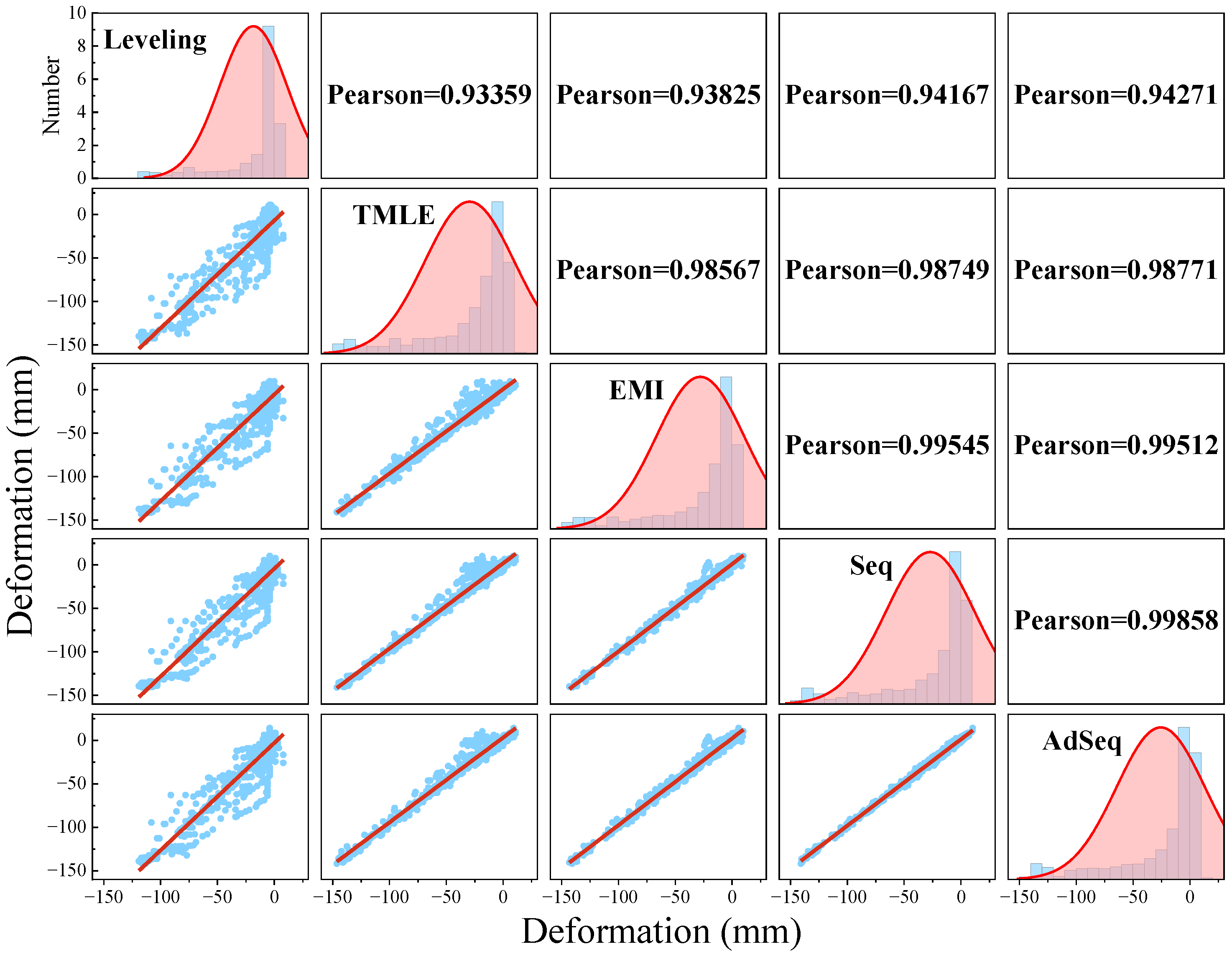 Figure 12, the Pearson correlation coefficient between the leveling data and the TMLE-based deformation results is the lowest, at about 0.934, followed by EMI at 0.938. Seq achieves a higher correlation of 0.942, while the proposed AdSeq maintains the strongest agreement with the leveling data, reaching 0.943, further demonstrating its superior deformation monitoring accuracy.