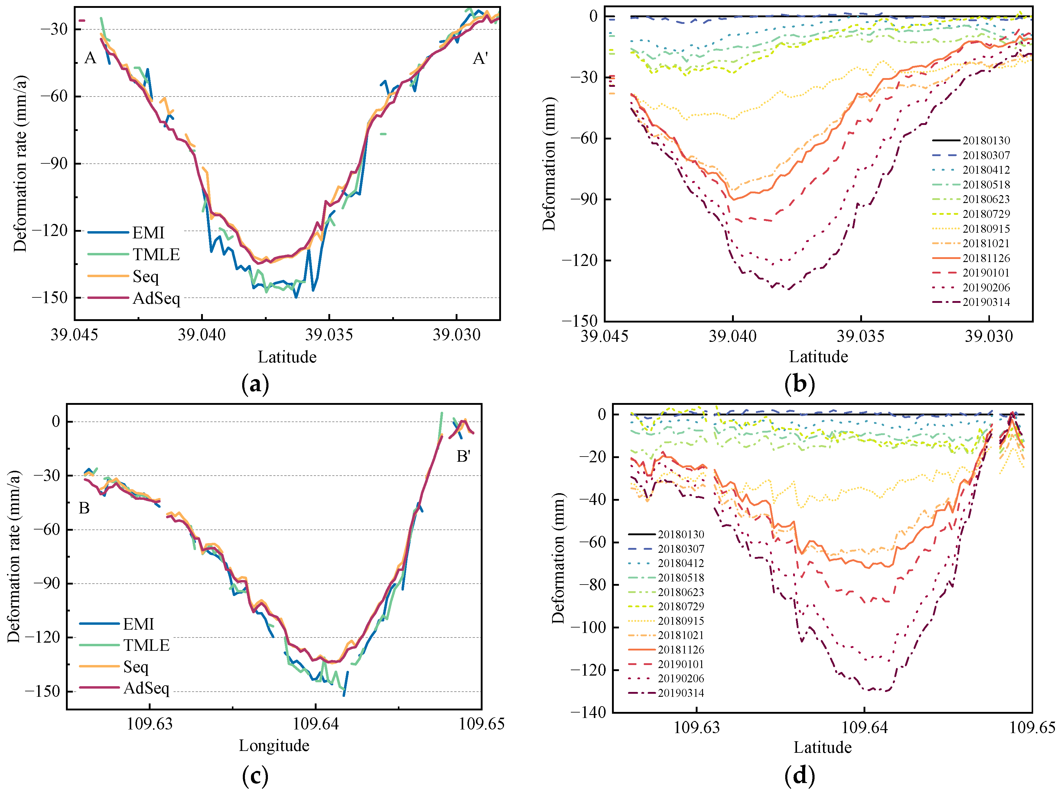 For profile B–B′, the maximum subsidence rate estimated by AdSeq and Seq are approximately 133.75 mm/a and 134.30 mm/a, respectively. However, EMI and TMLE yield larger maximum subsidence rates of 152.40 mm/a and 148.76 mm/a, likely due to the same overestimation effect caused by low monitoring point density. Additionally, the temporal evolution of surface deformation along profile B–B′ is also largely consistent with that of profile A–A′.