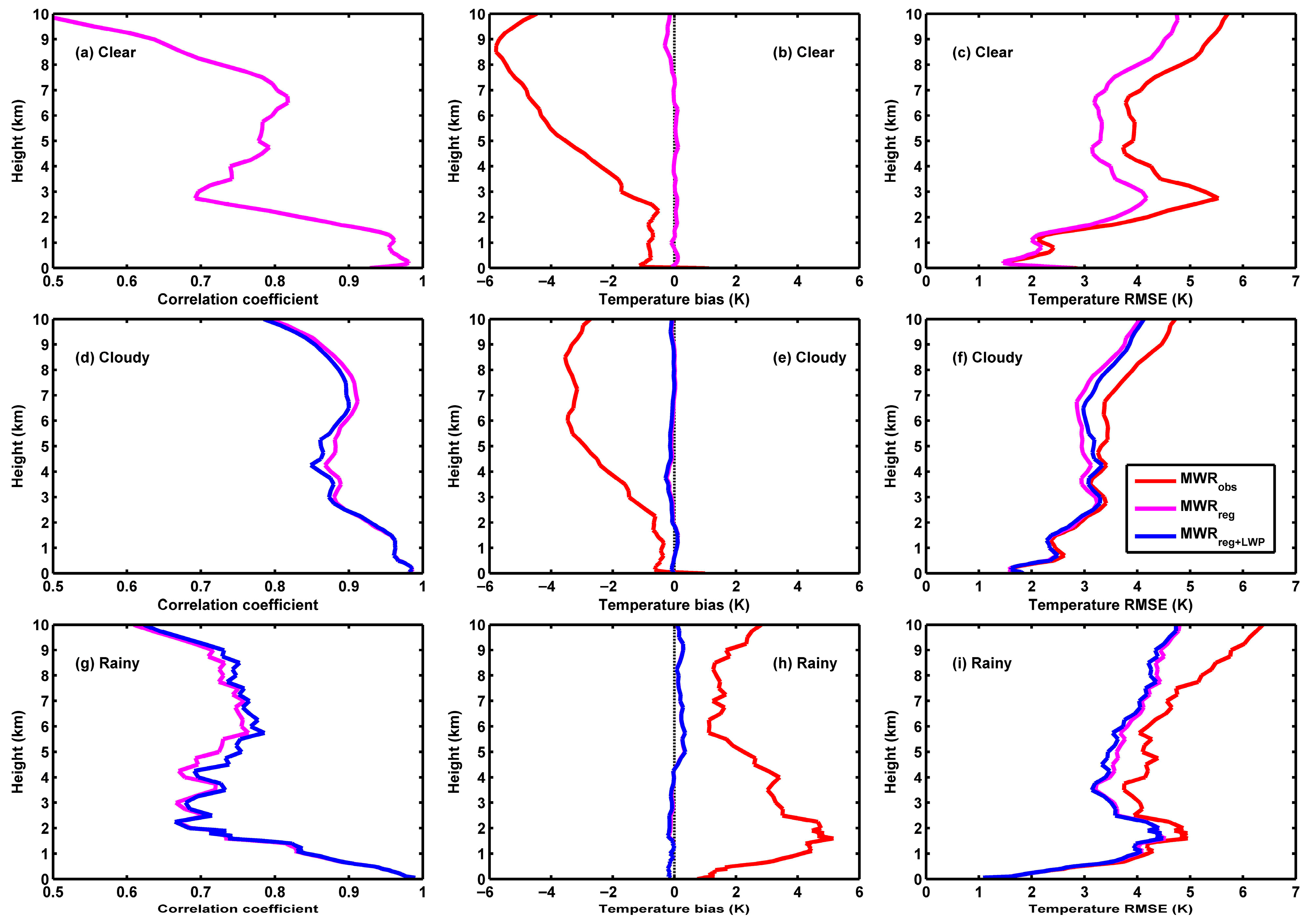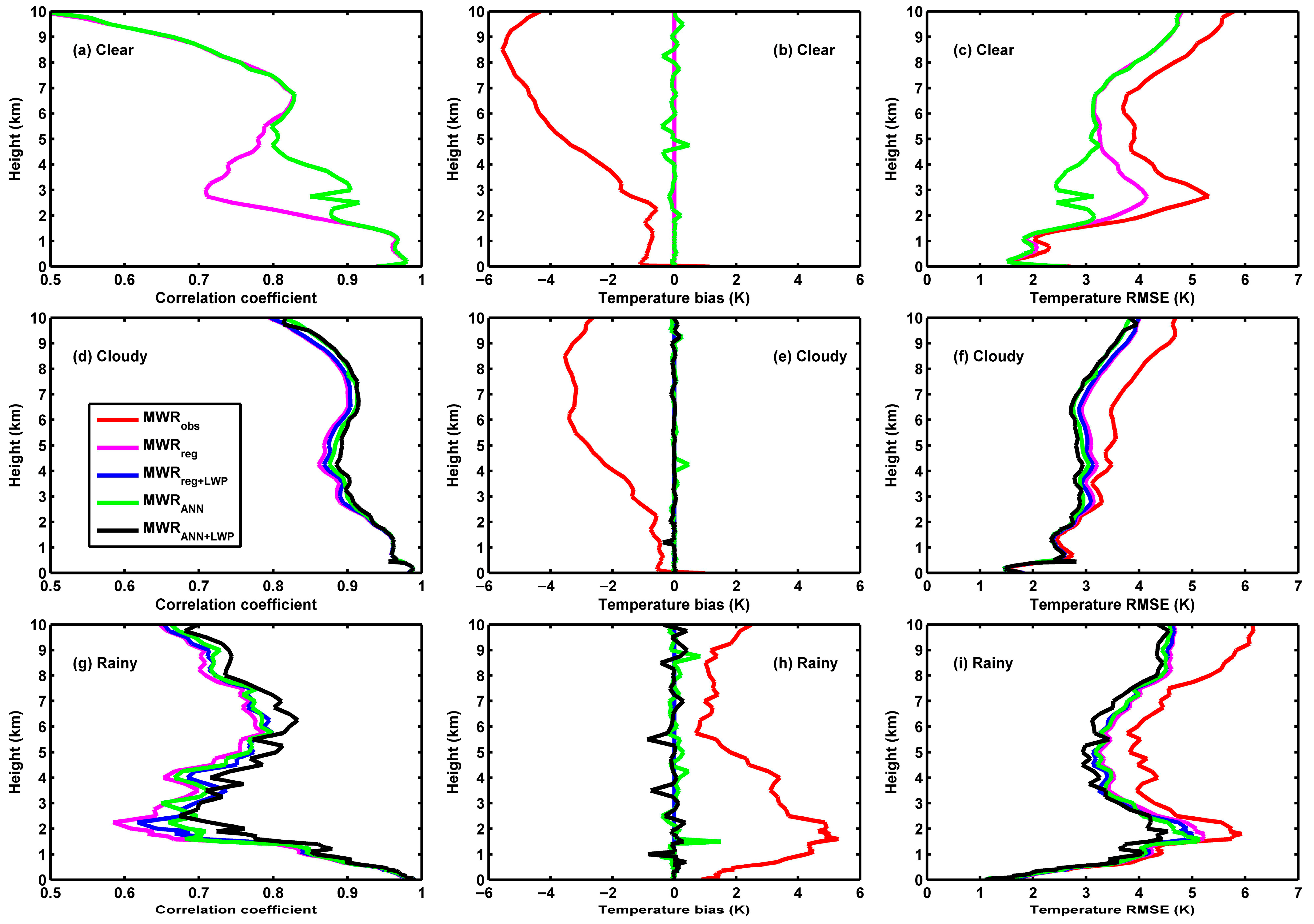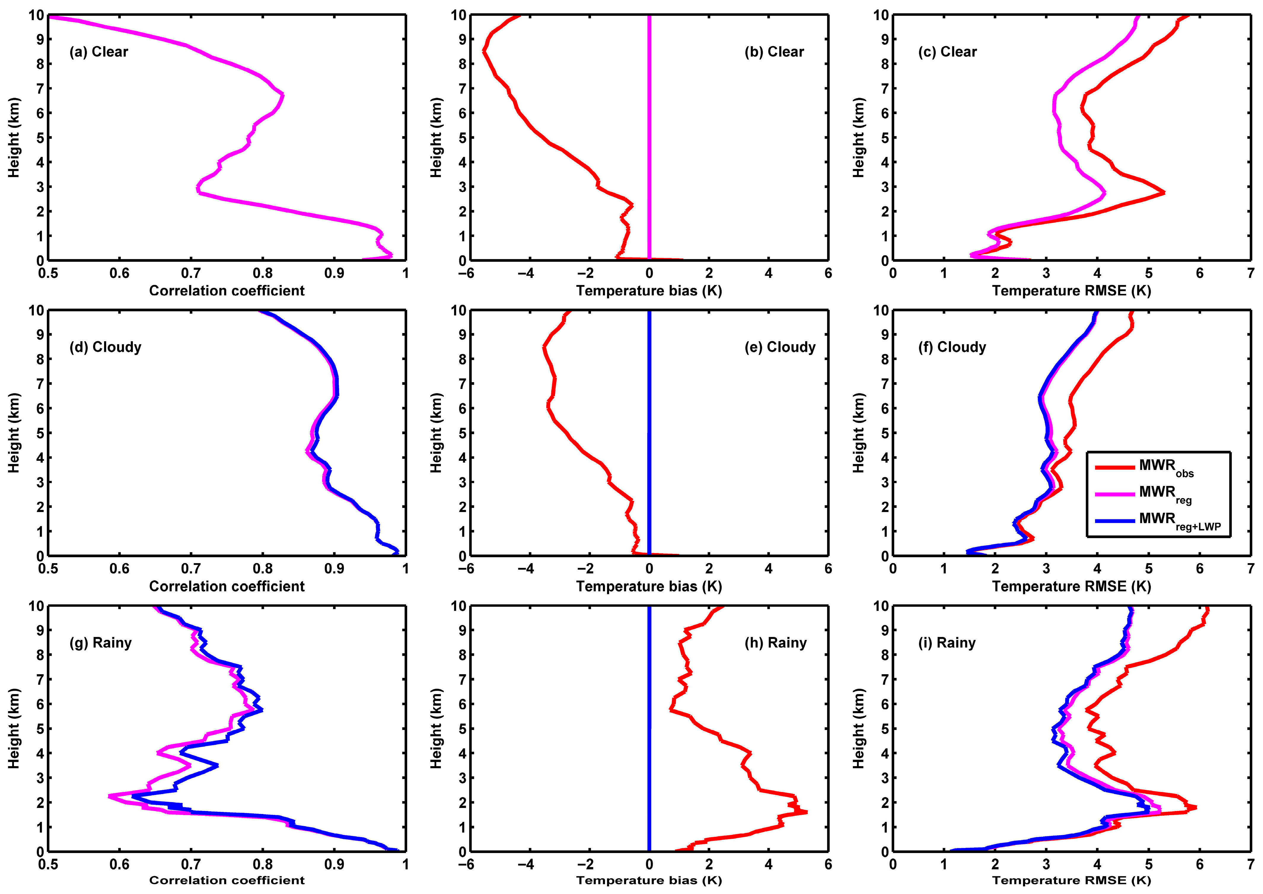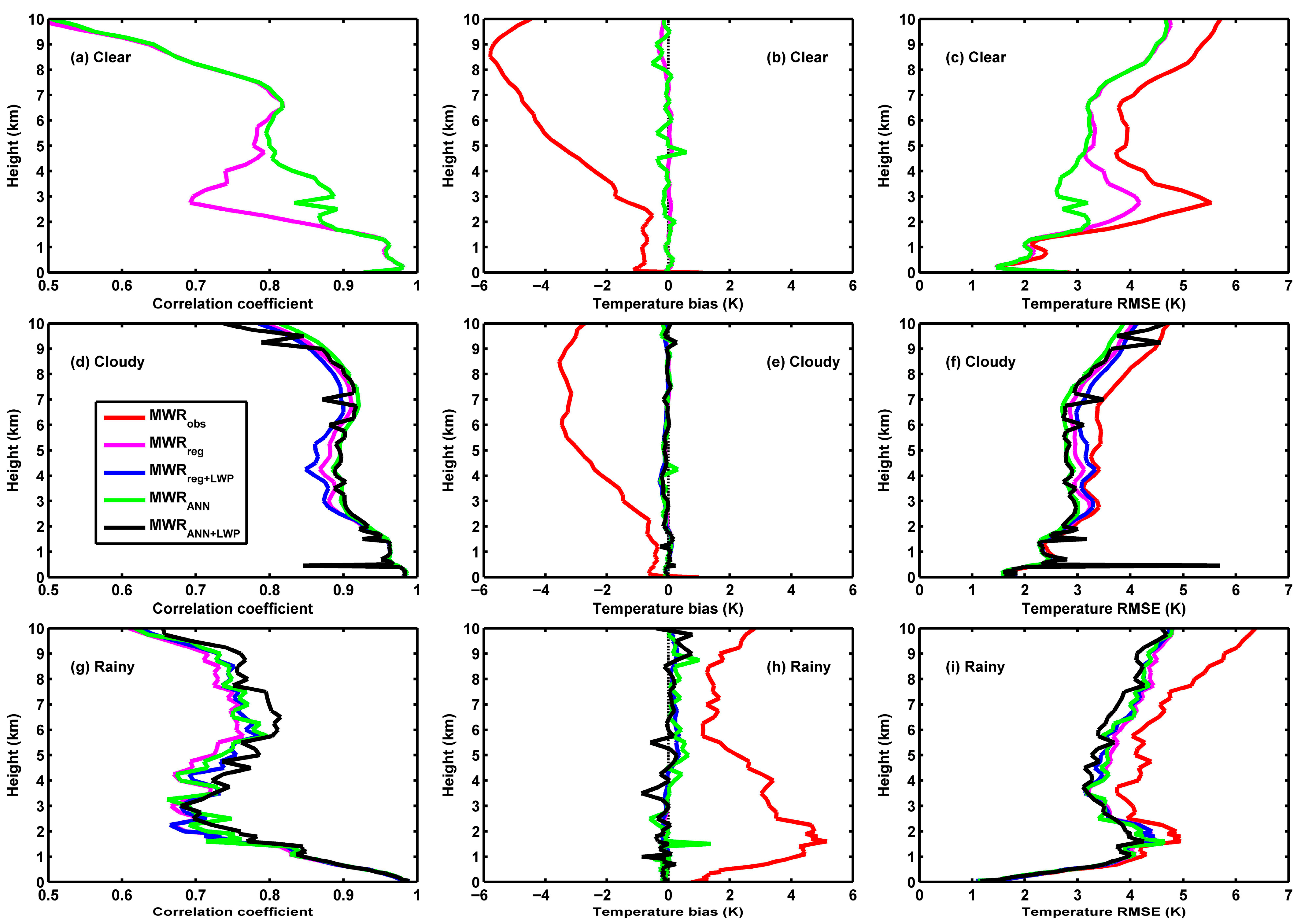 - The deviation of MWR retrievals from radiosonde measurements is caused by various factors, many of which depend on atmospheric conditions, and this results in different characteristics of MWR retrieval deviation in diverse skies. Therefore, correcting MWR retrieval deviation may require different methods.