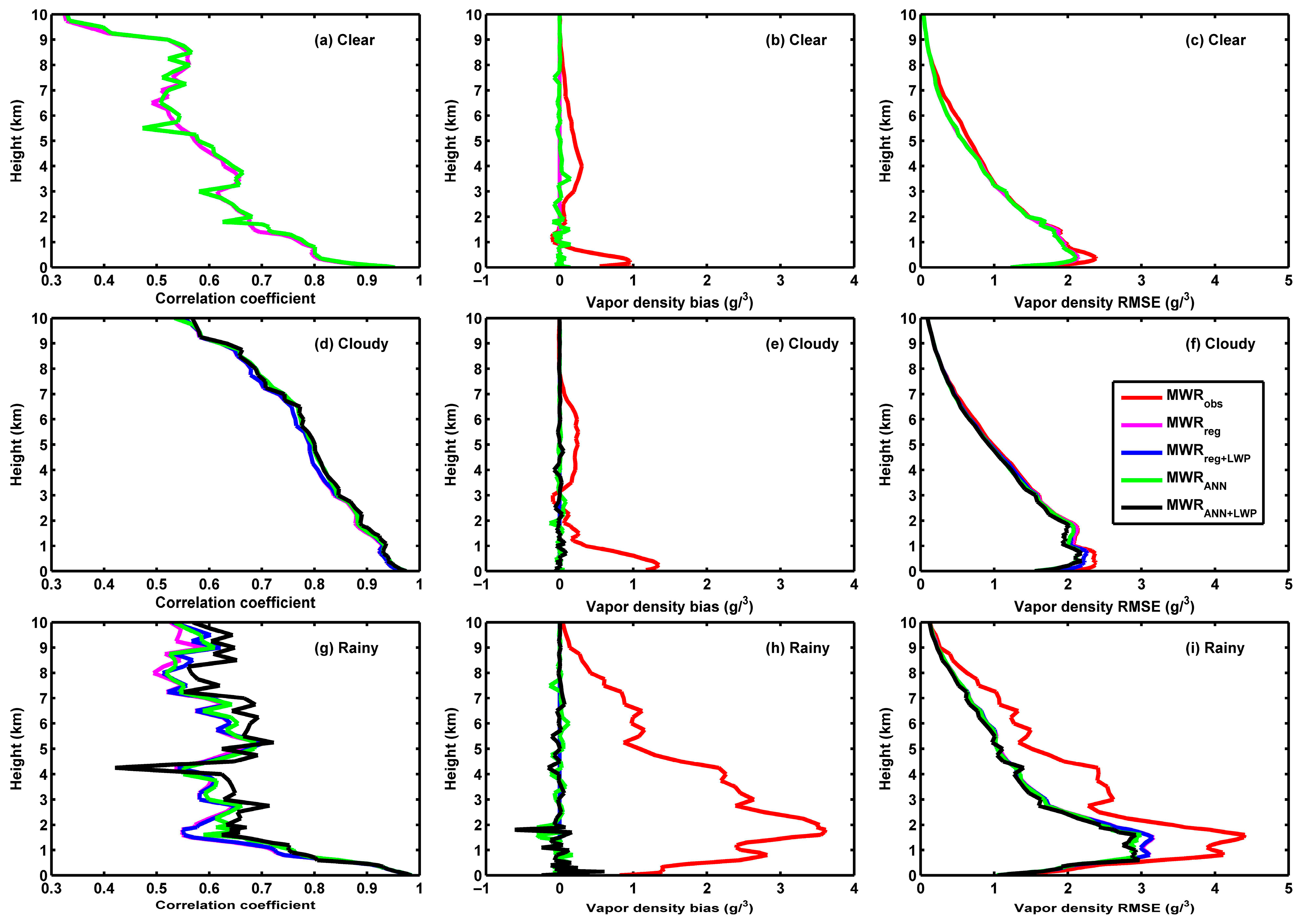 - Radiosonde temperature has a positive bias, while the humidity has a dry bias due to solar heating, and this leads to MWR temperature being colder and MWR vapor density being wetter than radiosondes in clear and cloudy skies. But, in rainy skies, the impact of raindrops results in a pseudo-high brightness temperature, which consequently leads to MWR temperature becoming warmer than radiosondes, while the wet MWR vapor density becomes more significant.