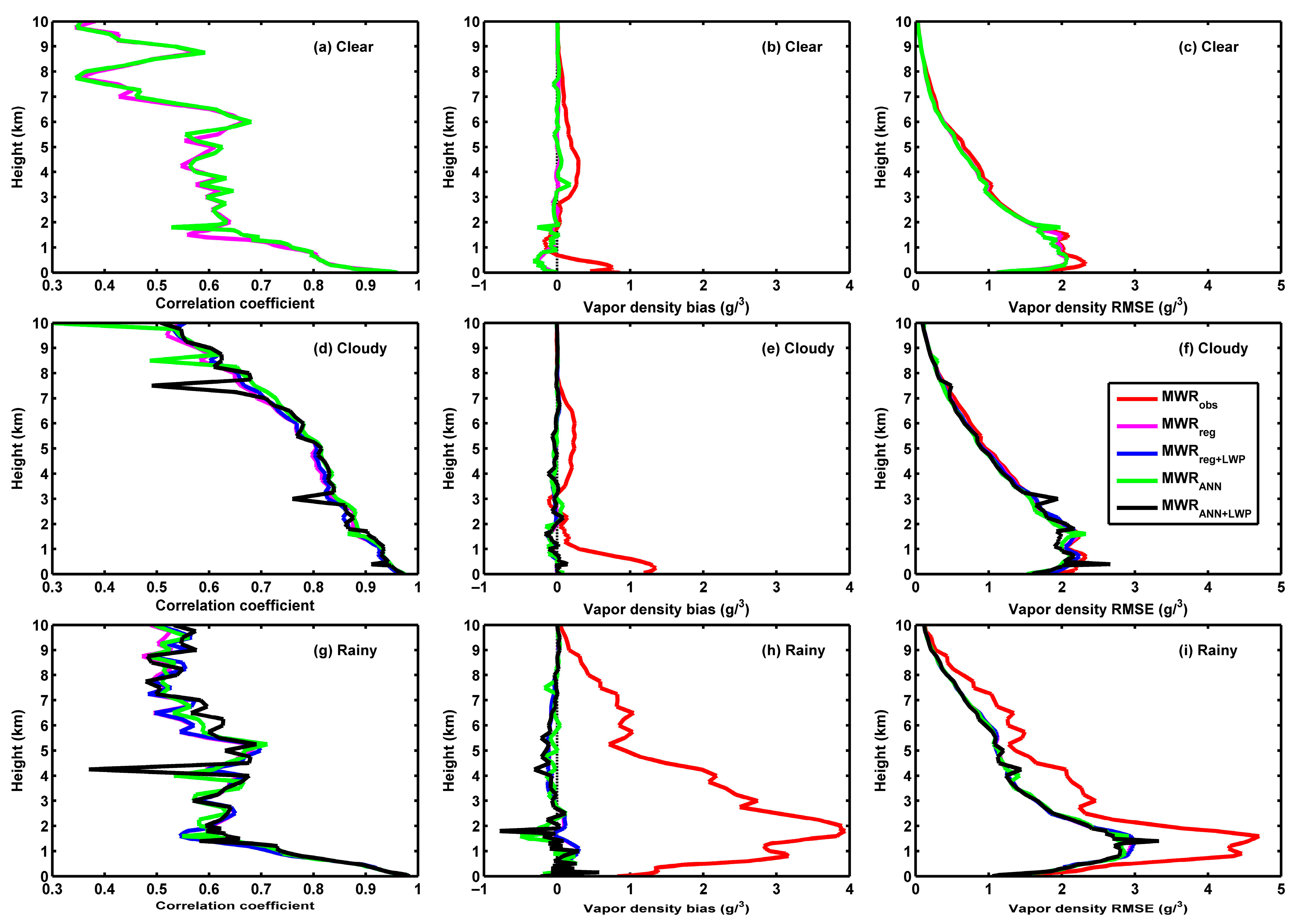 - Both regression and ANN models can reduce the biases of MWR temperature and vapor density against radiosondes to around zero in diverse skies. Moreover, after correcting using a regression model, the RMSEs of MWR temperature (vapor density) in clear, cloudy, and rainy skies decline by 14% (7%), 7% (4%), and 12% (29%), respectively, and the correction effect of the ANN model is slightly better than the regression model, with corresponding decreases of 19% (8%), 10% (8%), and 12% (30%), respectively.