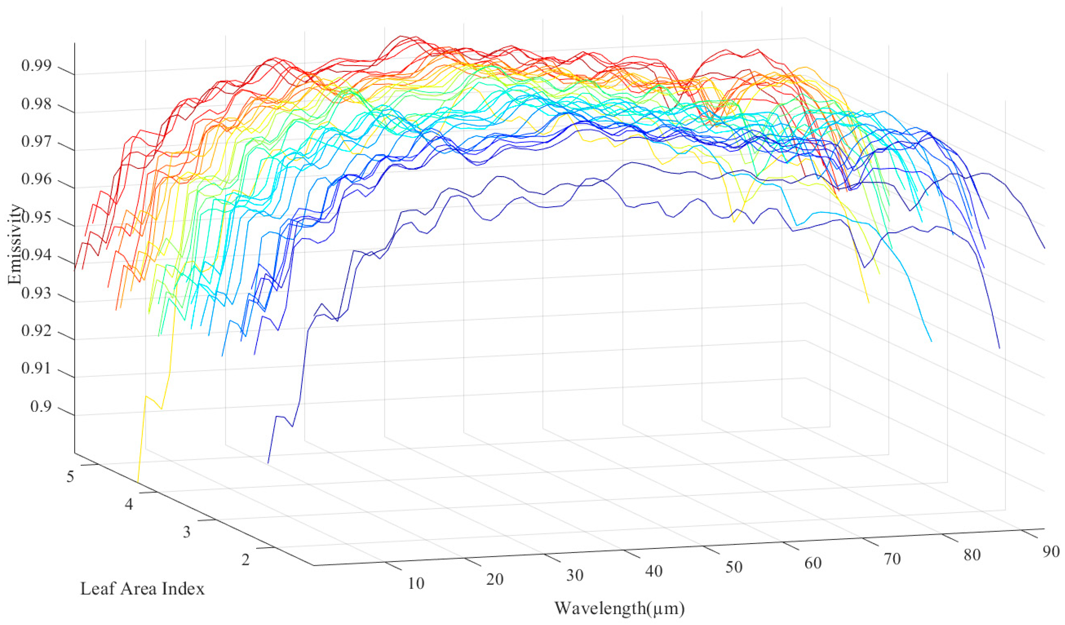 - Neinavaz, E.; Darvishzadeh, R.; Skidmore, A.K.; Groen, T.A. Measuring the response of canopy emissivity spectra to leaf area index variation using thermal hyperspectral data. Int. J. Appl. Earth Obs. Geoinf. 2016, 53, 40–47. [Google Scholar] [CrossRef]