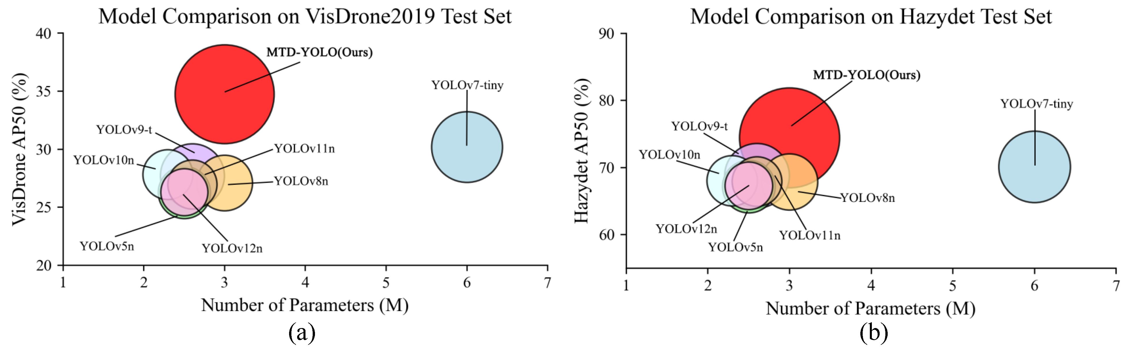 Figure 9. In dense small target scenarios, comparison models such as YOLOv8n are prone to problems like missed detections, boundary offsets, or box overlaps, while MTD-YOLO can accurately locate target boundaries, maintaining high detection integrity and boundary fit. Under low-visibility conditions such as haze, MTD-YOLO can still correctly identify fine-grained targets and effectively suppress background noise and false positives. These visualization results, together with the quantitative evaluation metrics, fully demonstrate the superiority of MTD-YOLO in small target detection tasks.